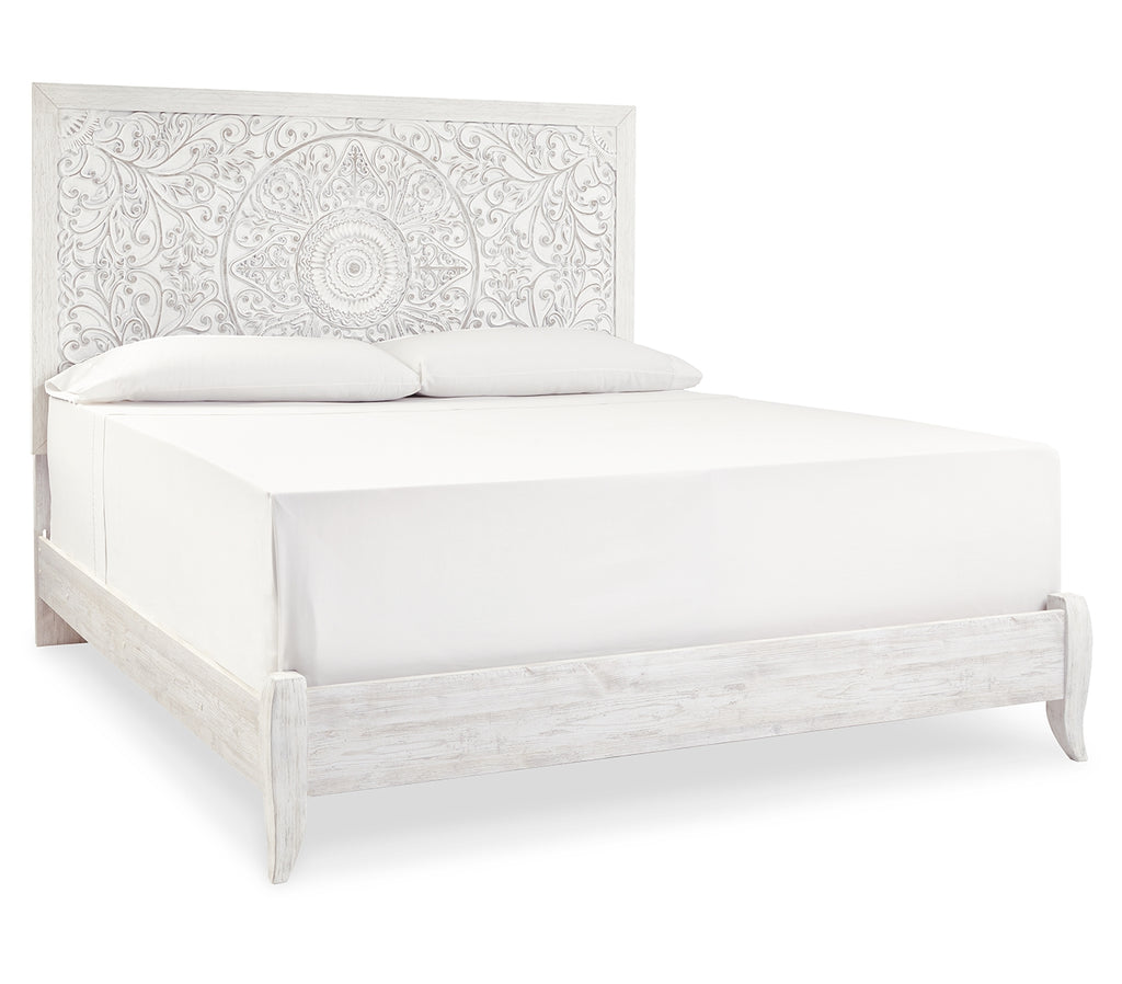 Showcase your trend-setting spirit with this bedroom package. Inspired by bohemian tapestries, the featured carved medallion patterns are a testament to boho-chic style. A whitewash finish on the various elements sets the foundation for a room bursting with personality.