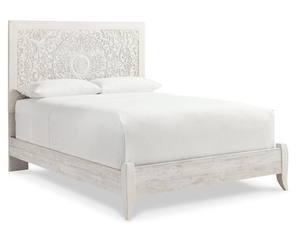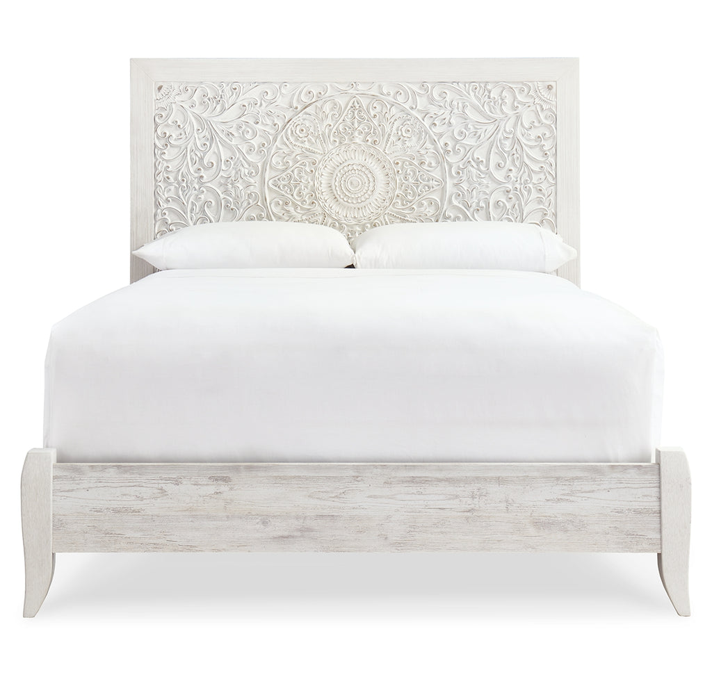 Live out your trendsetting free spirit with this queen headboard. Exquisite carved medallion pattern is a testament to boho-chic style. Charming whitewashed finish sets a foundation for a room bursting with personality. Adjustable height design offers added flexibility.