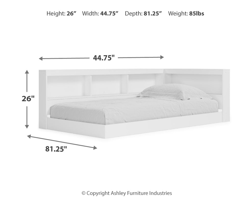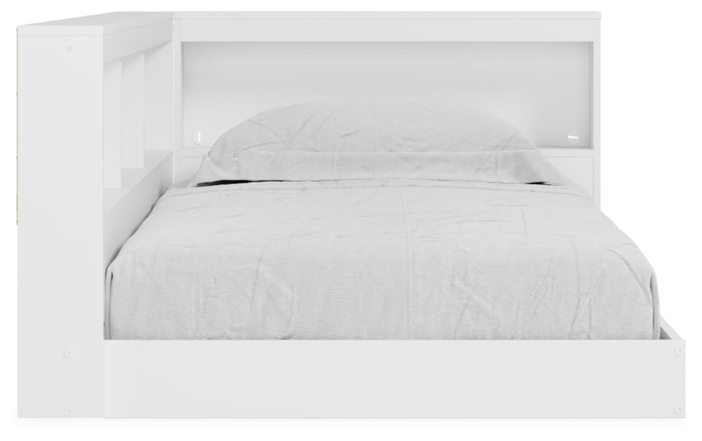 This full bookcase storage bed is an inspired find, beautifully blending contemporary and casual style. Its matte white finish keeps things simple, while the bookshelf storage creates added function. This charming storage bed also offers slim-profile dual USB chargers and requires no additional foundation.
