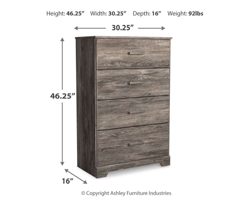 With its clean-lined look and modern attitude, this chest of drawers is a fresh style awakening. A warm gray hue over replicated oak grain easily complements other furniture finishes. Smooth drawer fronts with antiqued pewter-tone handles complete the aesthetic.