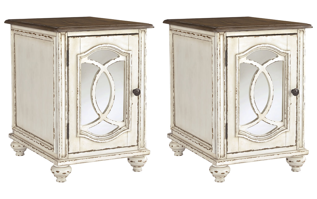 Elevating the art of traditional cottage styling, this 2-piece chairside end table set is sure to serve you beautifully for years to come. Antiqued two-tone aesthetic blends a chipped white with a distressed wood finished top for added charm. Cabinet door features inset mirror with filigree moulding for a fanciful twist.