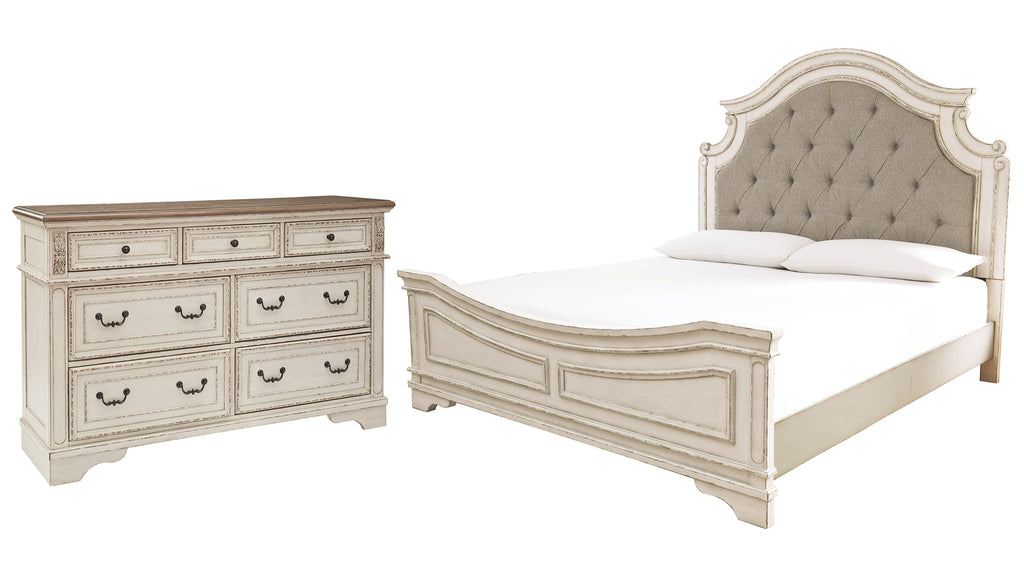 Elevating the art of traditional cottage styling, this romantic bed and dresser is your dream bedroom retreat realized. Affording curvaceous beauty, the brilliant crafting of this set wows with dramatic scalloped details. The distressed white finish complements both the tufted upholstery on the headboard and the two-tone aesthetic on the dresser for heirloom appeal. Create the cottage bedroom you’ve always wanted with this romantic bedroom set.