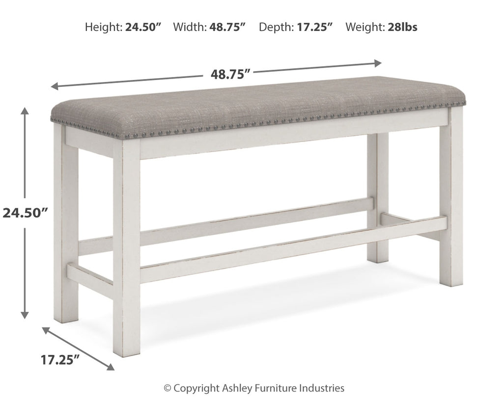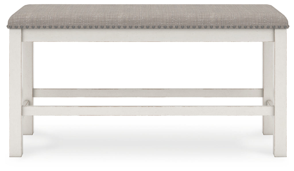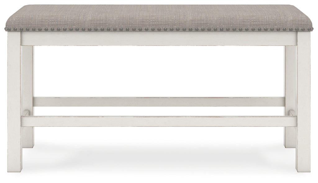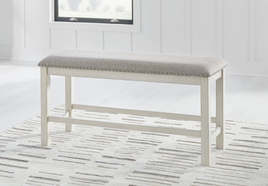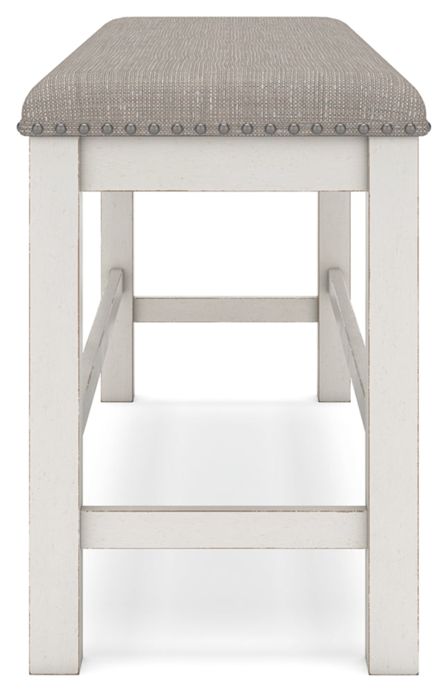 This counter height dining bench is sure to impress come mealtime. With its white finish and light gray upholstery, farmhouse-style seating has never been so fashionable. All that’s missing is you and your family.