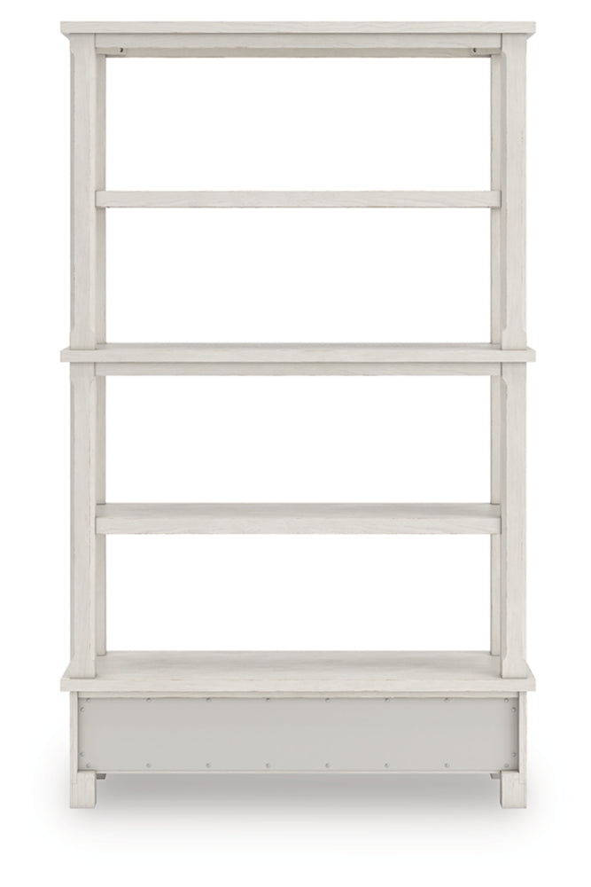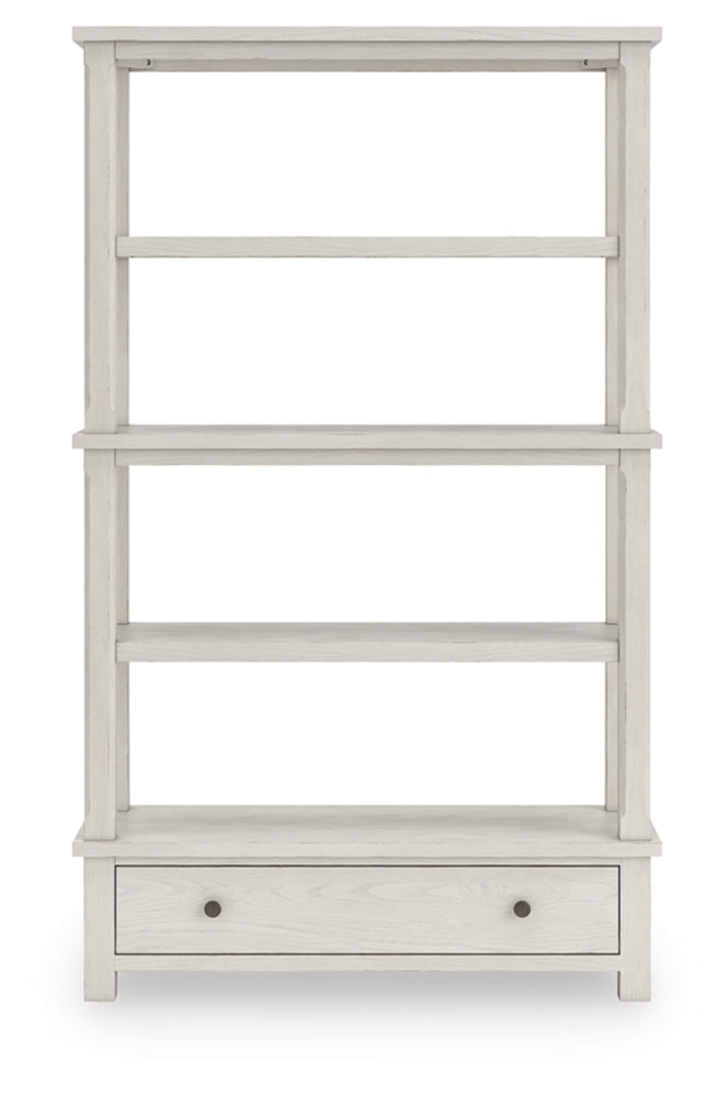 This bookcase is sure to impress when it’s time to study or work from home. With its antiqued white finish and wood grain texture, modern farmhouse-style workstations have never been so fashionable. The open four-shelf design—two adjustable and two fixed—is ideal for storage and displaying your treasures. And that large storage drawer brings even more function to your workspace. All that’s missing is you.