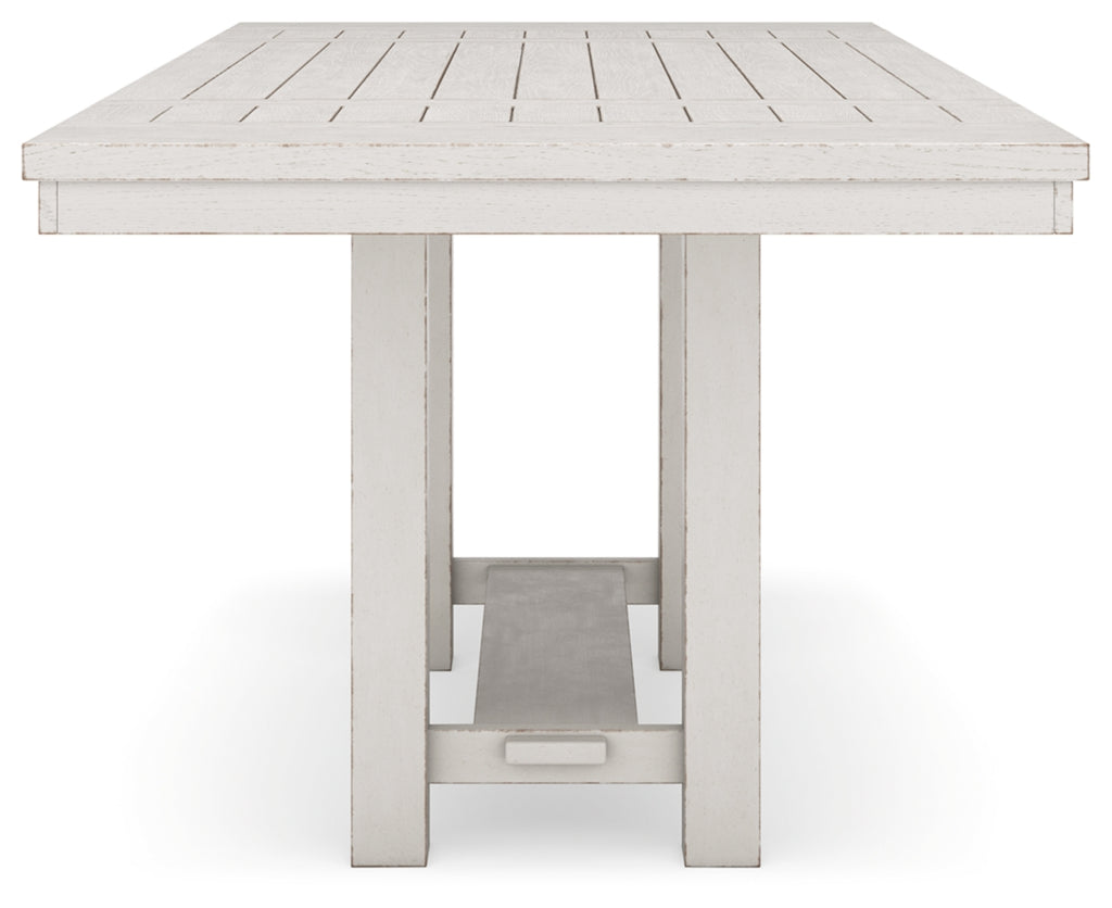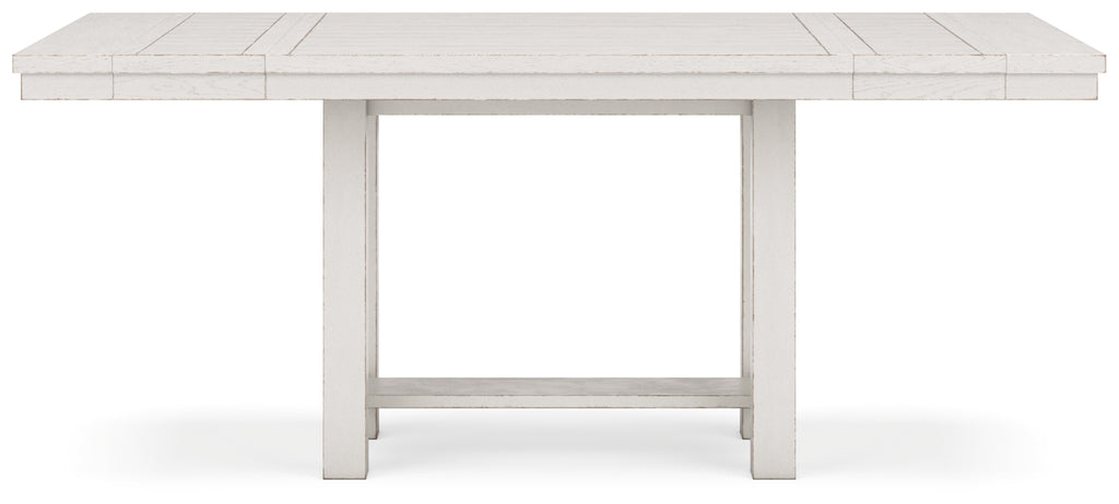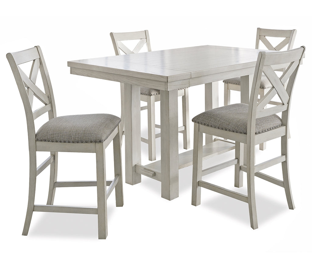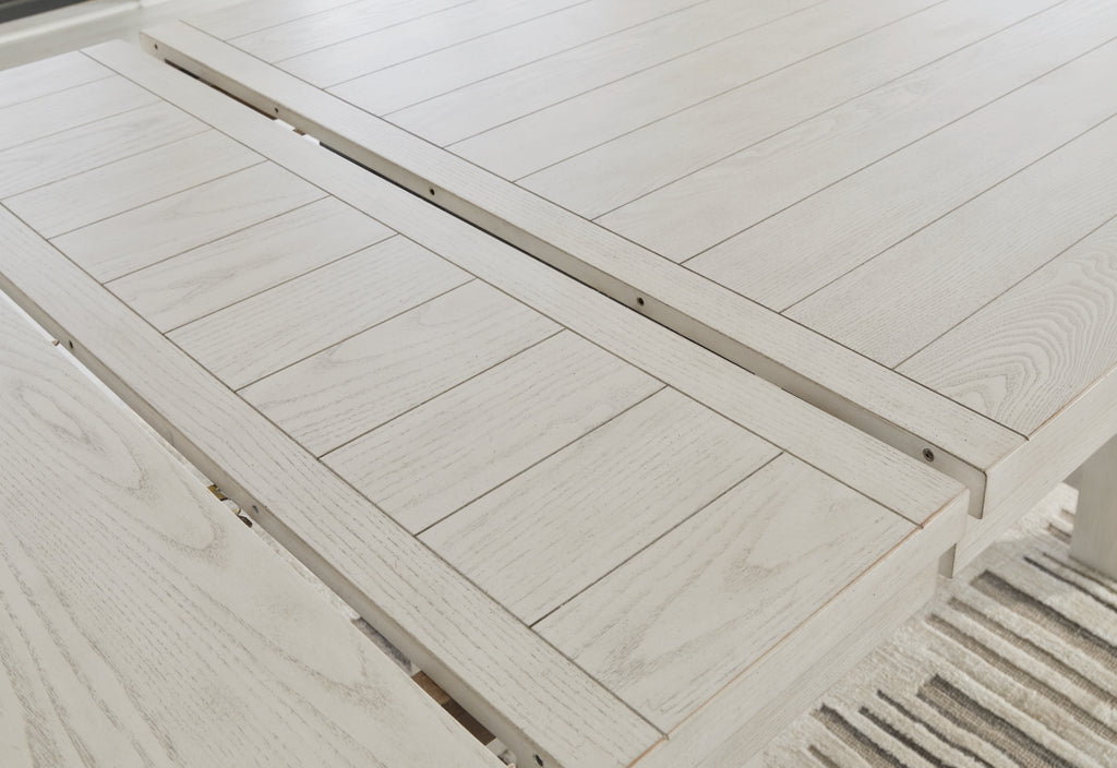 This dining package is sure to impress come mealtime. With its antiqued white finish, light gray upholstery and a planked effect tabletop that extends for additional seating, farmhouse-style seating has never been so fashionable. All that’s missing is you and your family.