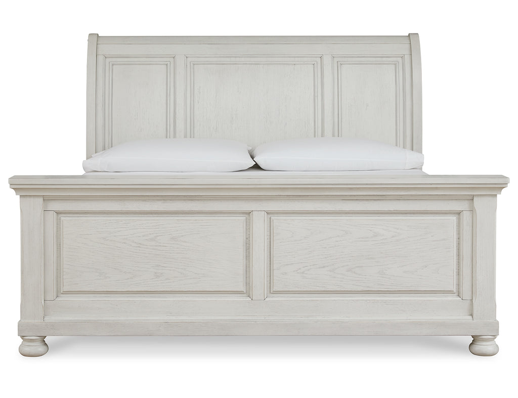 Elegant, timeless furnishings take your bedroom to the next level. Nothing does that better than this king sleigh bed. The antiqued white finish with a wonderful grain texture radiates sophistication, making this the perfect piece to round out the ultimate tasteful bedroom.