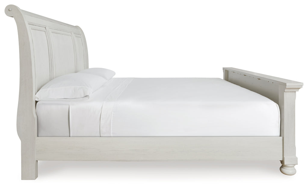 Elegant, timeless furnishings take your bedroom to the next level. Nothing does that better than this king sleigh bed. The antiqued white finish with a wonderful grain texture radiates sophistication, making this the perfect piece to round out the ultimate tasteful bedroom.