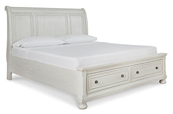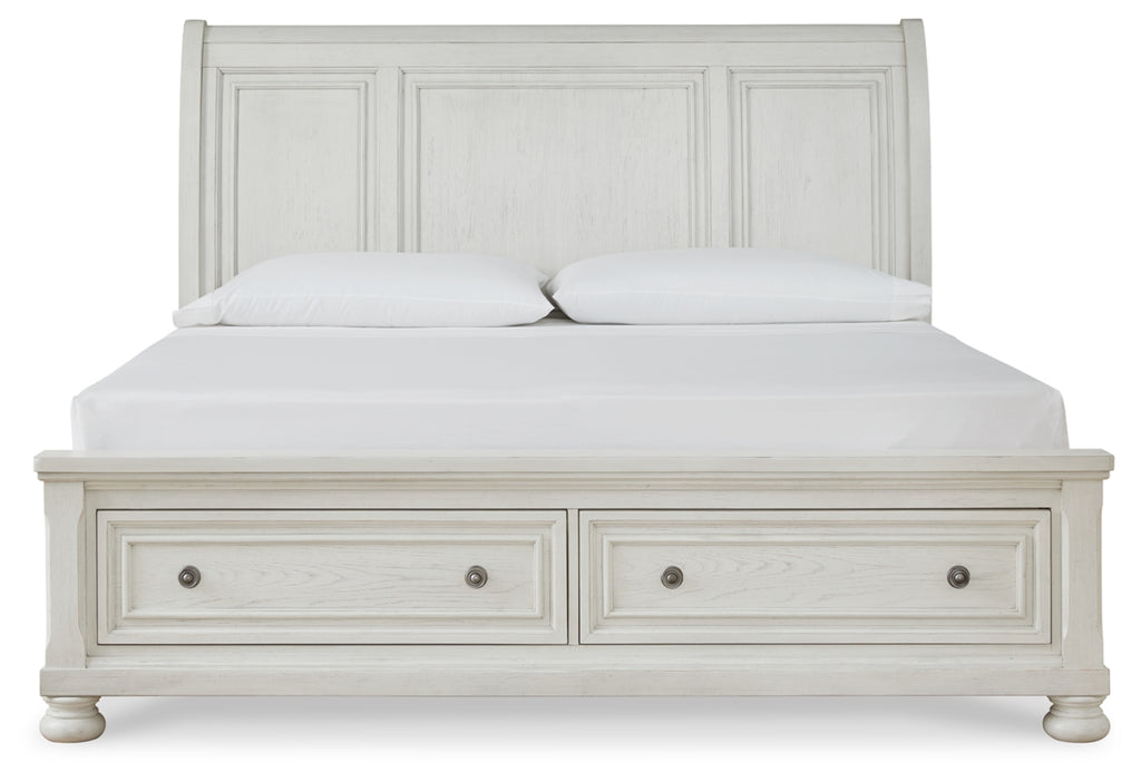 Elegant, timeless furnishings take your bedroom to the next level. Nothing does that better than this California king sleigh bed with storage footboard. The antiqued white finish with a wonderful grain texture radiates sophistication, while the dark bronze-tone hardware adds an ornate touch. Rounding things out, the subtle curve of the headboard keeps the look polished and poised.