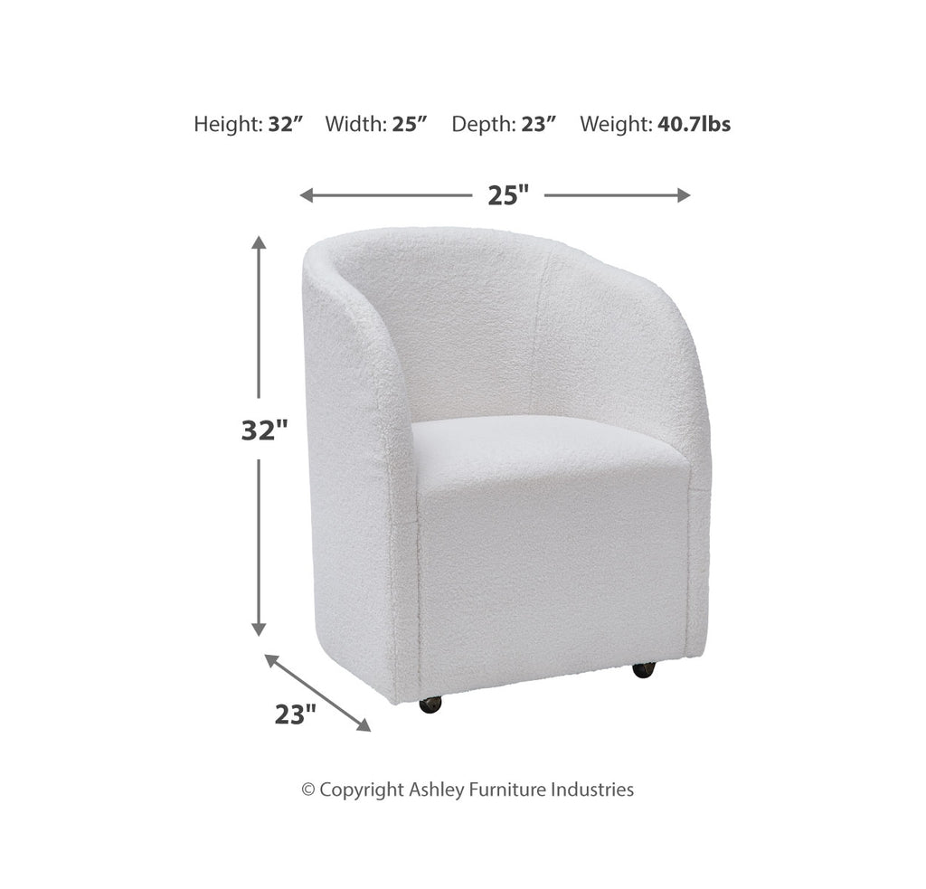 Inspired by art deco design, this fully upholstered dining chair makes a lasting impression in a simply stunning way. Its magnificent curved silhouette is enhanced with a neutral boucle upholstery that’s so pleasing to the palate. This is the piece you’ve been looking for to elevate your contemporary decor whether you’re dining, listening to your latest playlist or binge-watching with friends. Plus, it’s set on casters so it’s easy to move around.