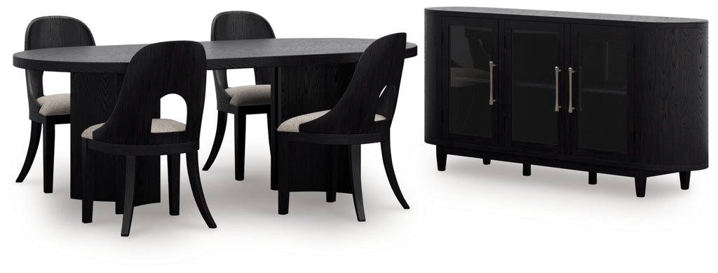 Inspired by art deco design, this dining package makes a lasting impression in a simply stunning way. Magnificent curved silhouettes are enhanced with a rich layered black finish and neutral upholstery. This set makes the contemporary statement you’ve been seeking to elevate late-night dinners and full-on family feasts.