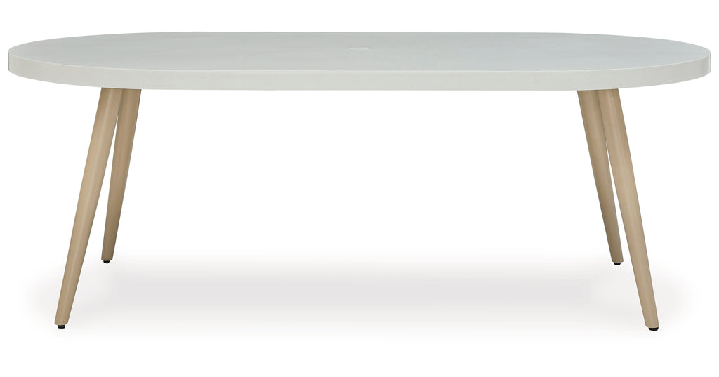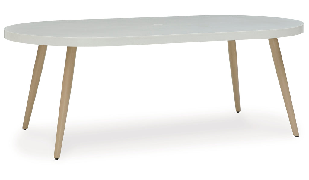This dining table invites your casual contemporary style outdoors. With an elegant faux stone top, it expertly marries refined design with durability. At this table, breezy summer mornings and cold winter nights are made all the more enjoyable.