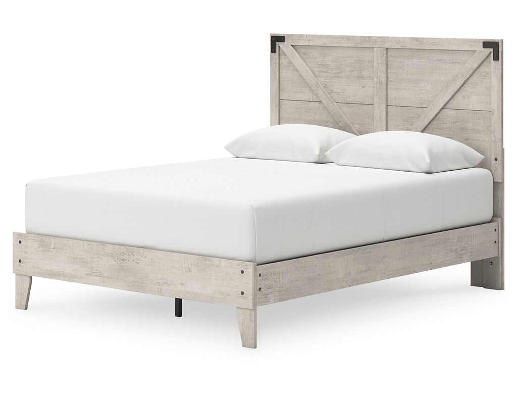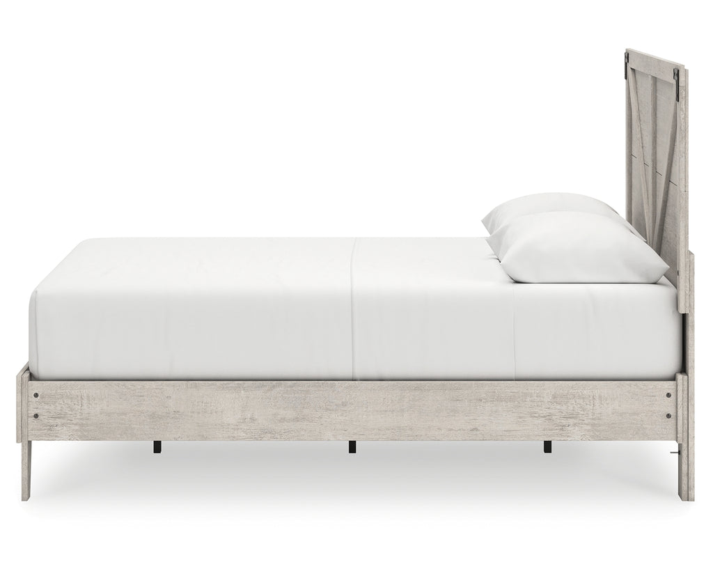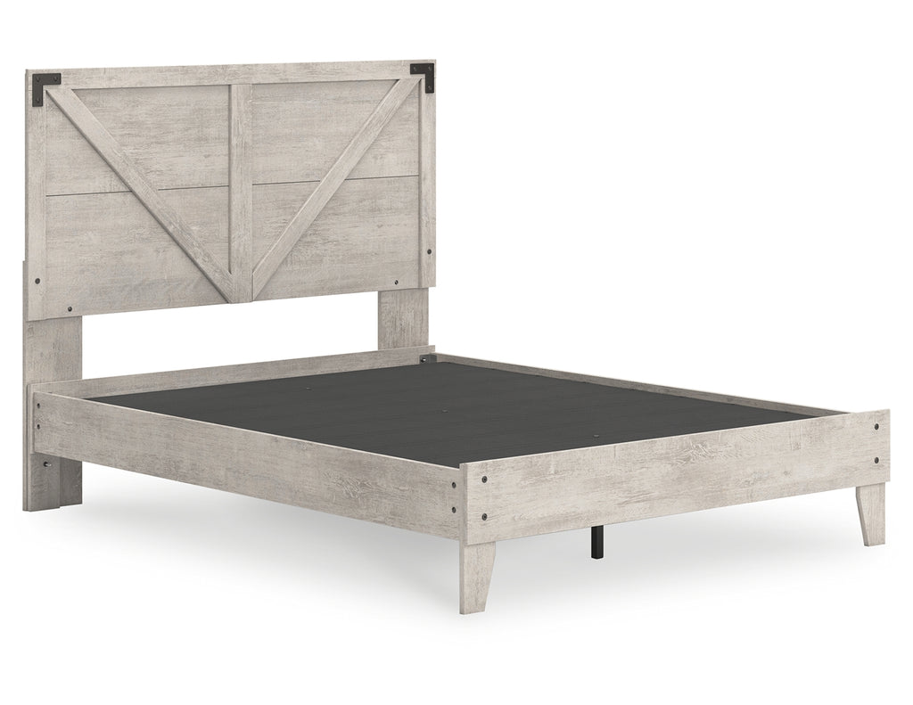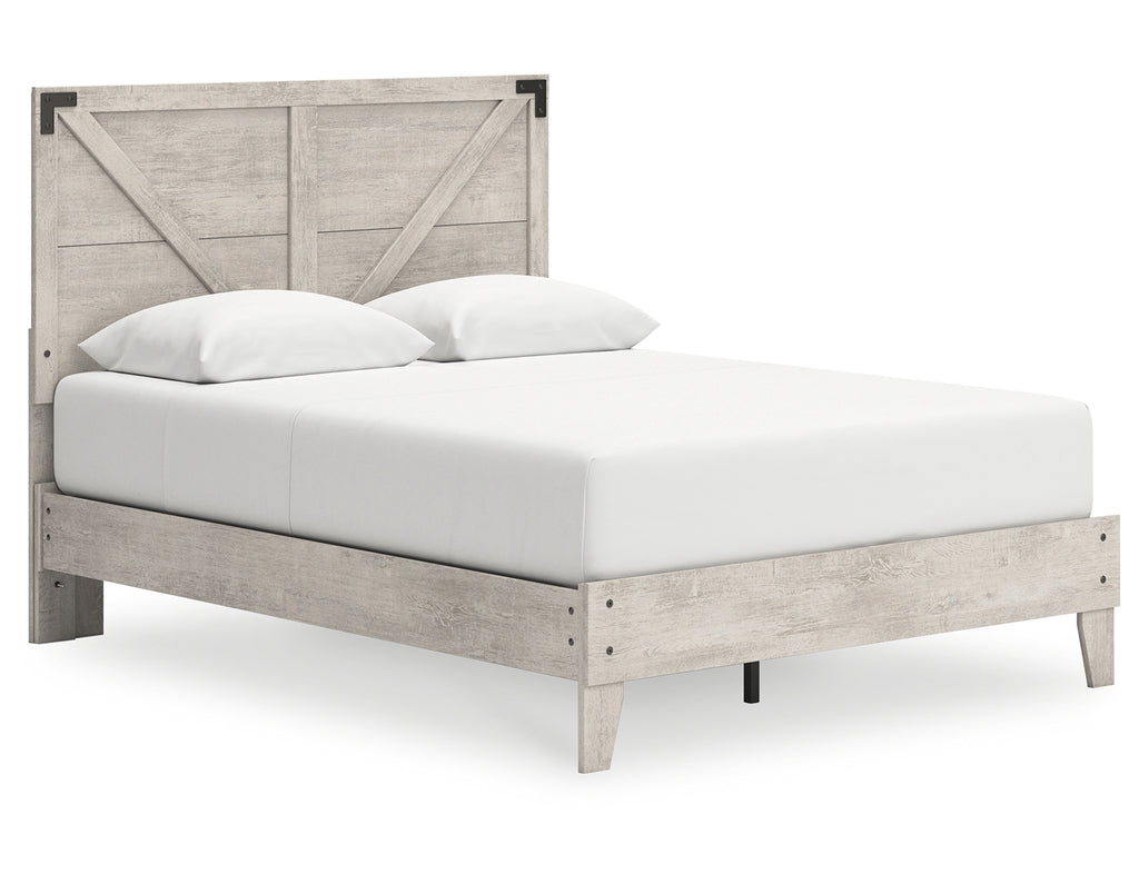 Give casual a new meaning with the chic look of this queen platform bed. A light gray finish over replicated oak grain keeps it laid-back and inviting, while crossbuck details and pewter-tone accents add a modern farmhouse touch. Talk about a delightfully relaxed vibe in your inner sanctum.