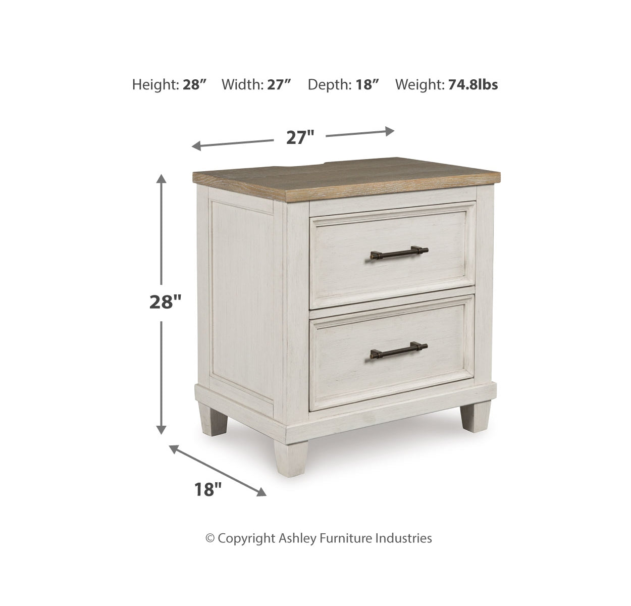 This bedroom set elevates the art of modern farmhouse design. Its two-tone aesthetic blends antiqued white and light grayish brown for added charm. Framed drawer fronts and dark rustic bar pulls lend a country feel. Conveying a feeling of relaxed comfort, this set is sure to carry you away to a dreamy time and place.