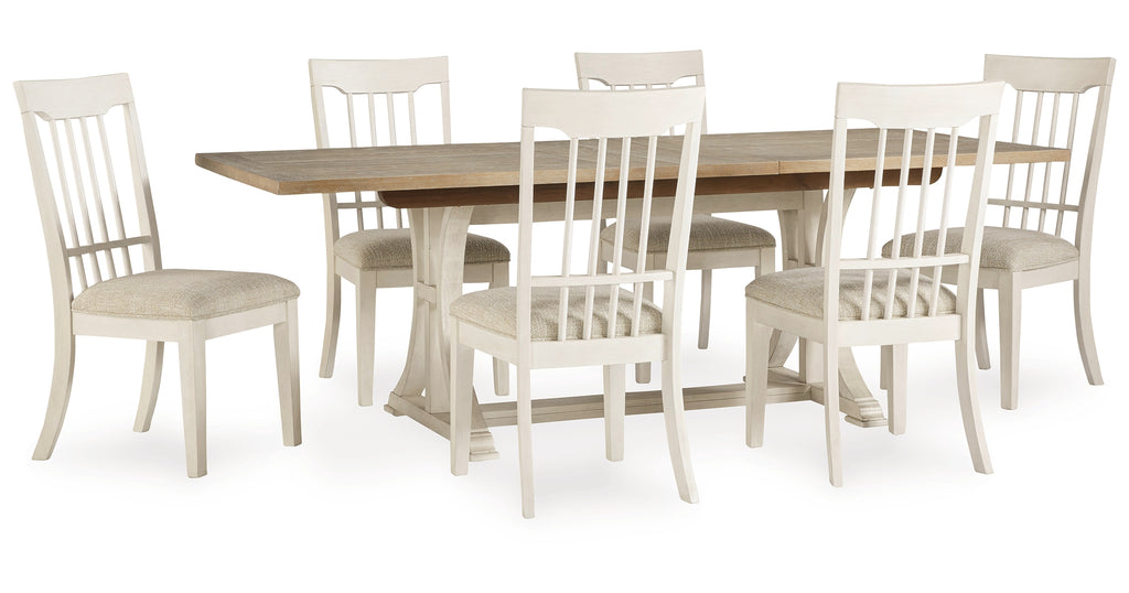 This dining set elevates the art of modern farmhouse design. Its charming two-tone aesthetic blends antiqued white and light grayish brown finishes for a feeling of relaxed comfort. Now your only worry is what to serve for dinner.