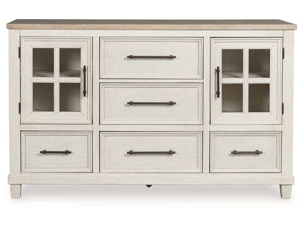 This bedroom set elevates the art of modern farmhouse design. Its two-tone aesthetic blends antiqued white and light grayish brown for added charm. Framed drawer fronts and dark rustic bar pulls lend a country feel. Conveying a feeling of relaxed comfort, this set is sure to carry you away to a dreamy time and place.