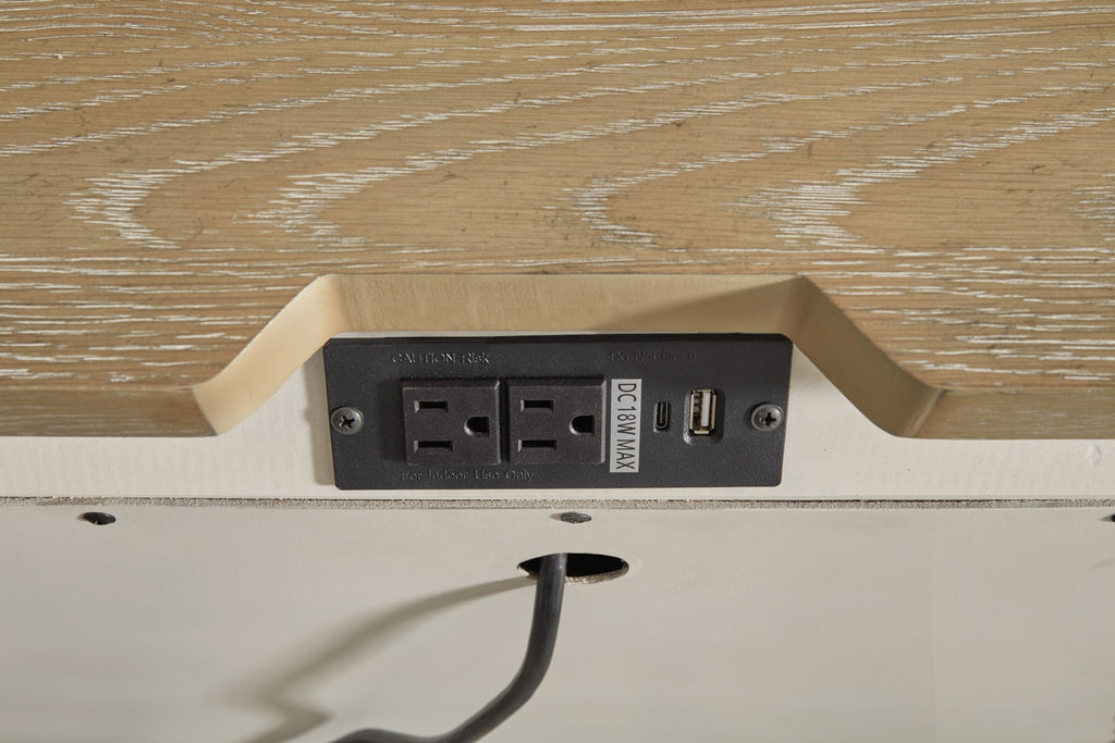 This bedroom set elevates the art of modern farmhouse design. Its two-tone aesthetic blends antiqued white and light grayish brown for added charm. Framed drawer fronts and dark rustic bar pulls lend a country feel. Conveying a feeling of relaxed comfort, this set is sure to carry you away to a dreamy time and place.