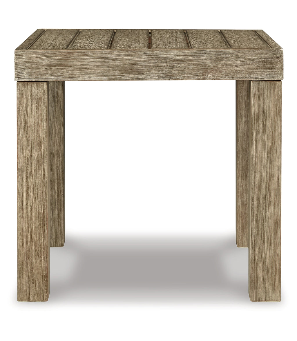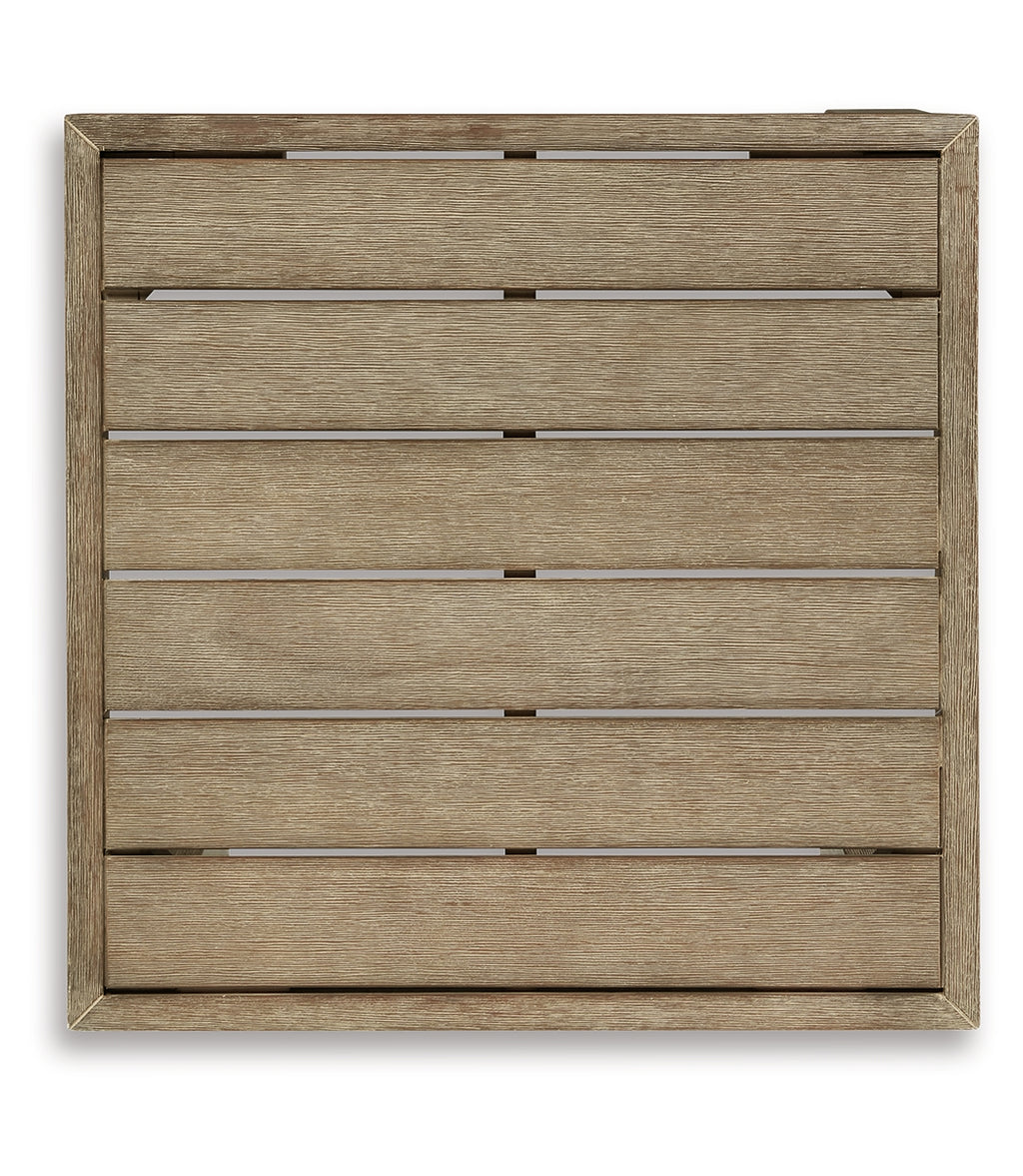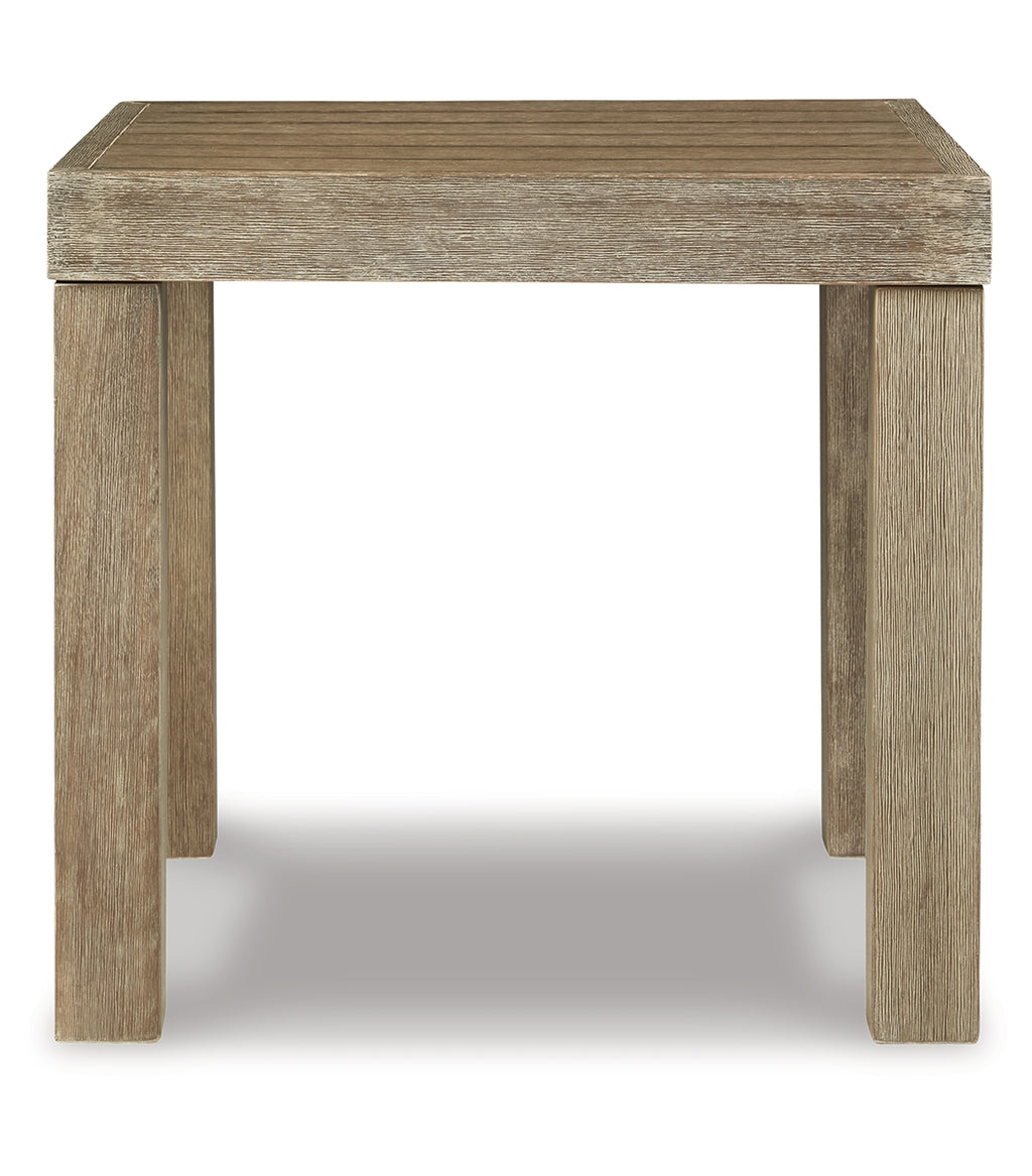 Beautifully on point, this outdoor end table is the natural choice for modern minimalists who know that less is more. Quality crafted of eucalyptus wood, this ultra clean-lined outdoor table is enriched with a multi-step embossed finish that both brings out the wood’s natural grain and protects it from the elements for seasons of fun in the sun. Incorporating form and function, the plank top naturally sheds rainwater.