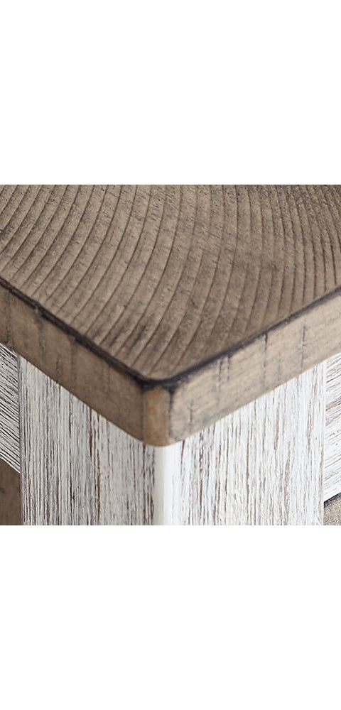 This counter height table with storage invites you to raise the bar on small space living. An inspired choice for coastal chic or modern farmhouse settings, this clean-lined, simply striking table doubles the charm with a brown tone top with plank effect, paired with a grayish white base with rub through effect for timeworn appeal. Built-in 8-bottle wine rack and pair of open shelves make the most of every inch of space.