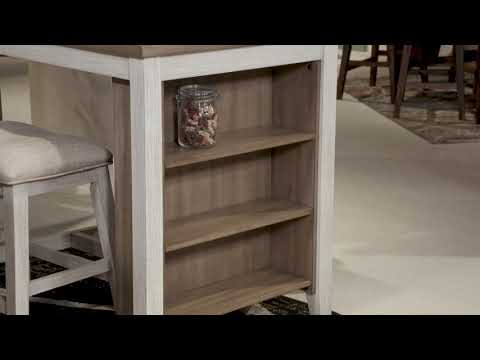 This clever counter height table and bar stool set invites you to raise the bar on small space living. An inspired choice for coastal chic or modern farmhouse settings, this clean-lined, simply striking set doubles the charm with brown tone plank effect tops, paired with grayish white bases with rub through effect for timeworn appeal. The table’s built-in open shelves make the most of every inch of space.