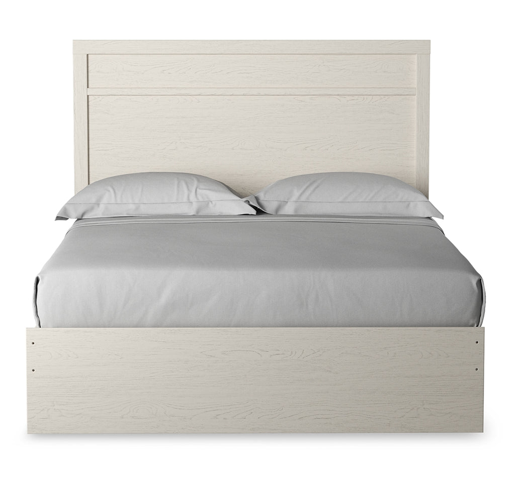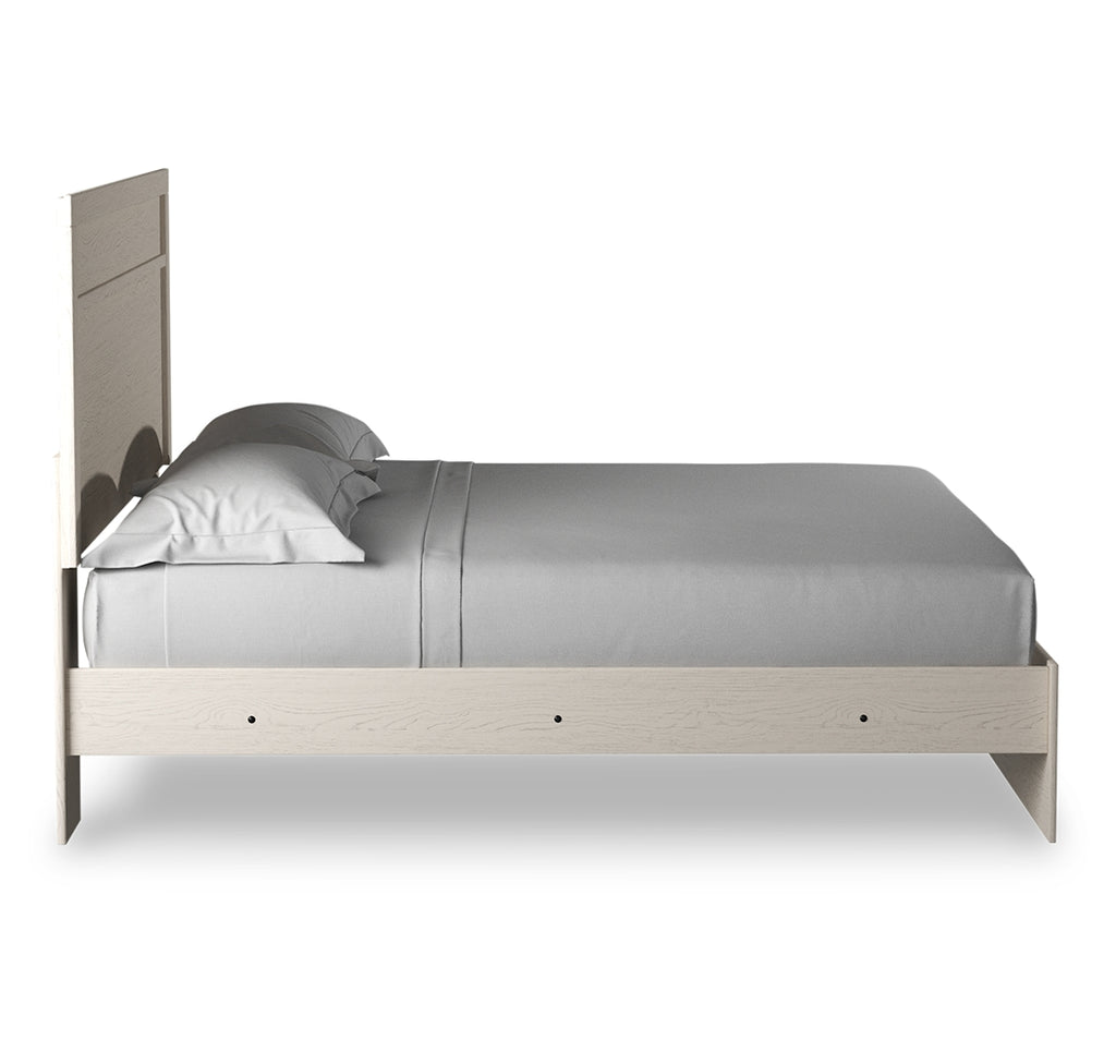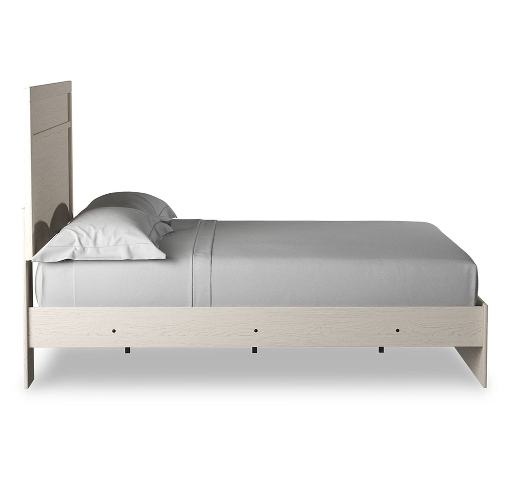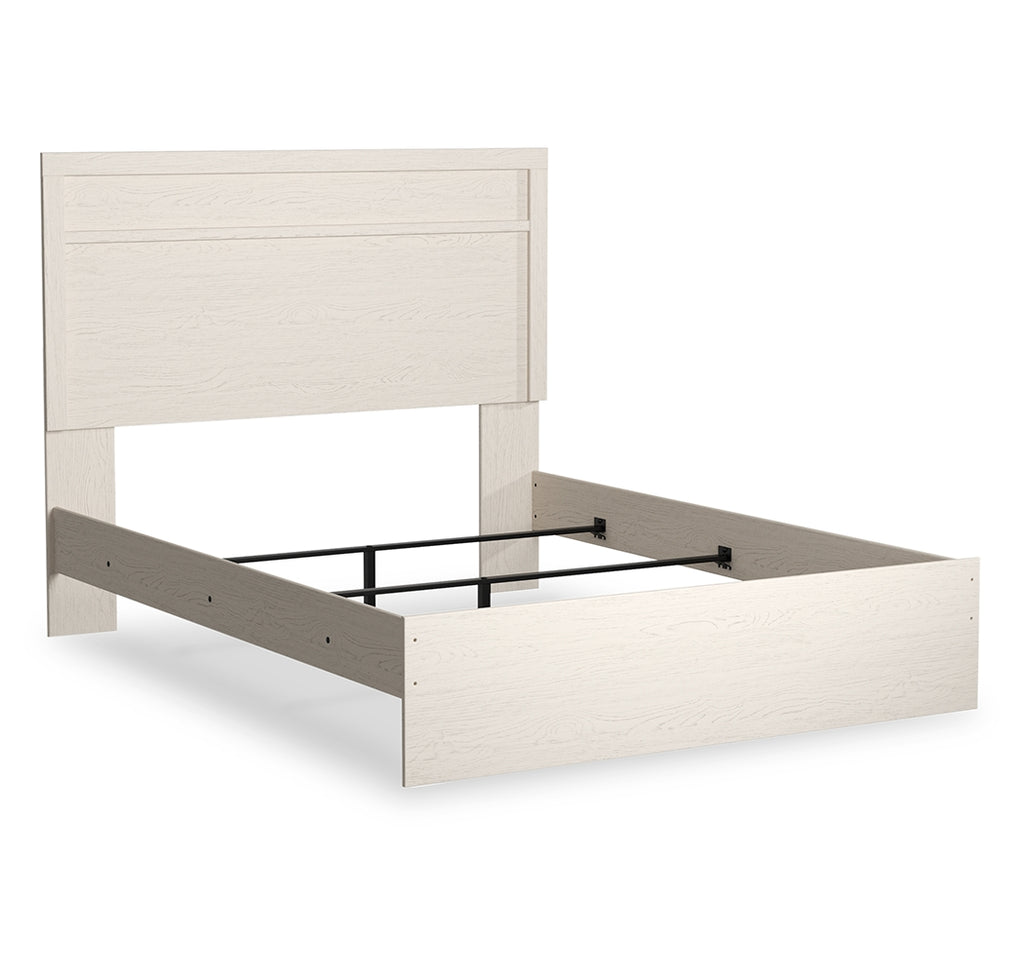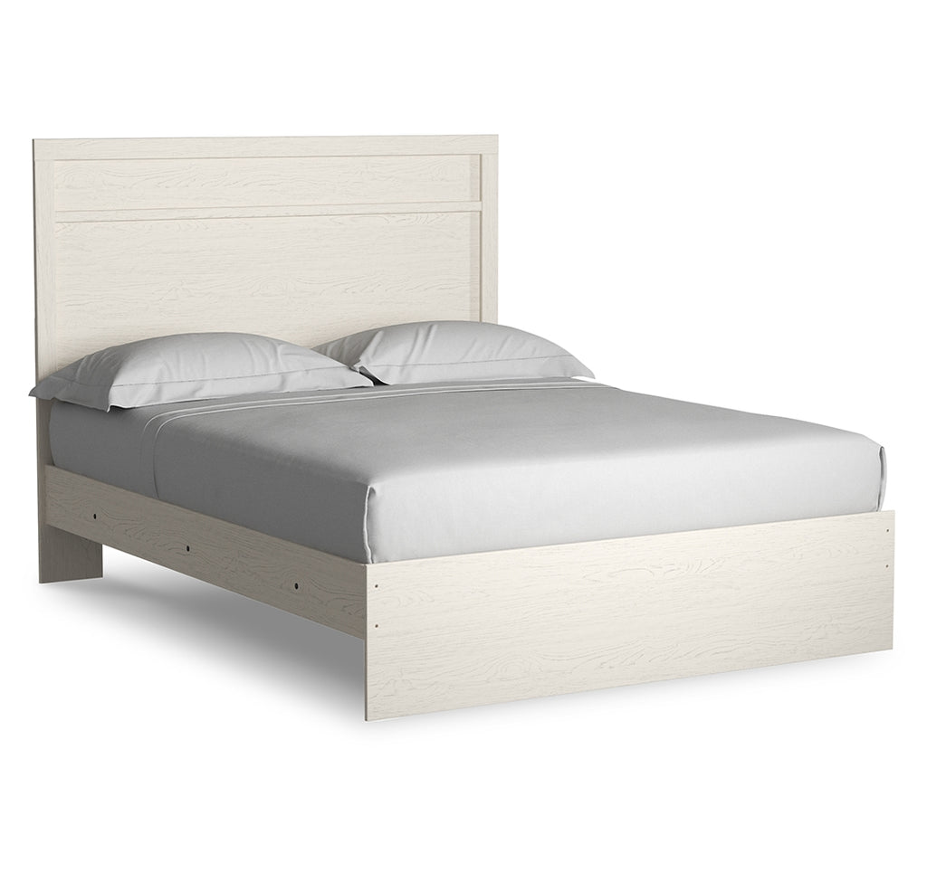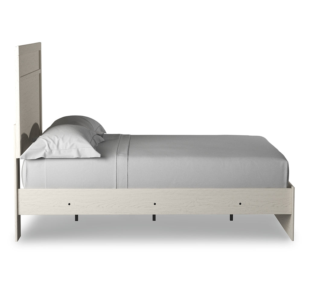 With its clean-lined look and modern attitude, this queen panel bed is a fresh style awakening. A crisp, white hue over subtle replicated wood grain easily complements other furniture finishes. The simple, unadorned profile is given depth and dimension with the addition of plank-style moulding on the headboard—proof that beauty lies in the details.