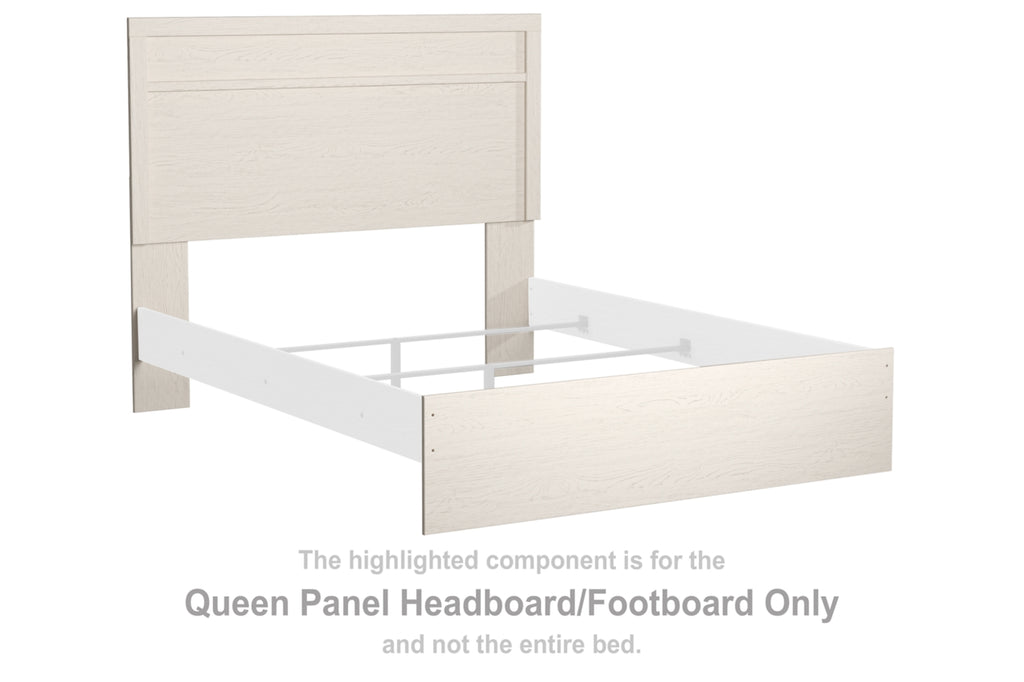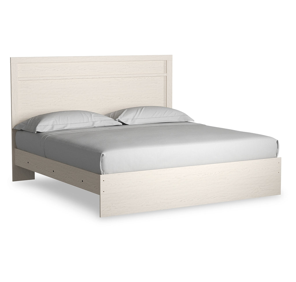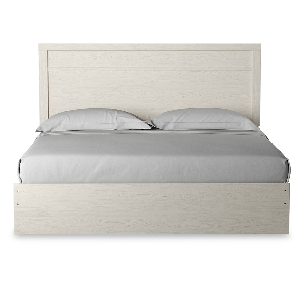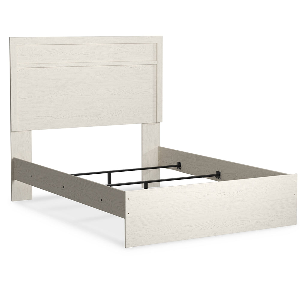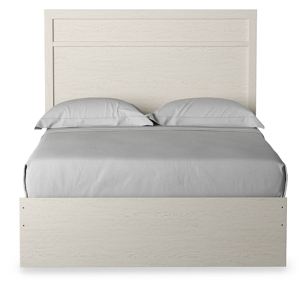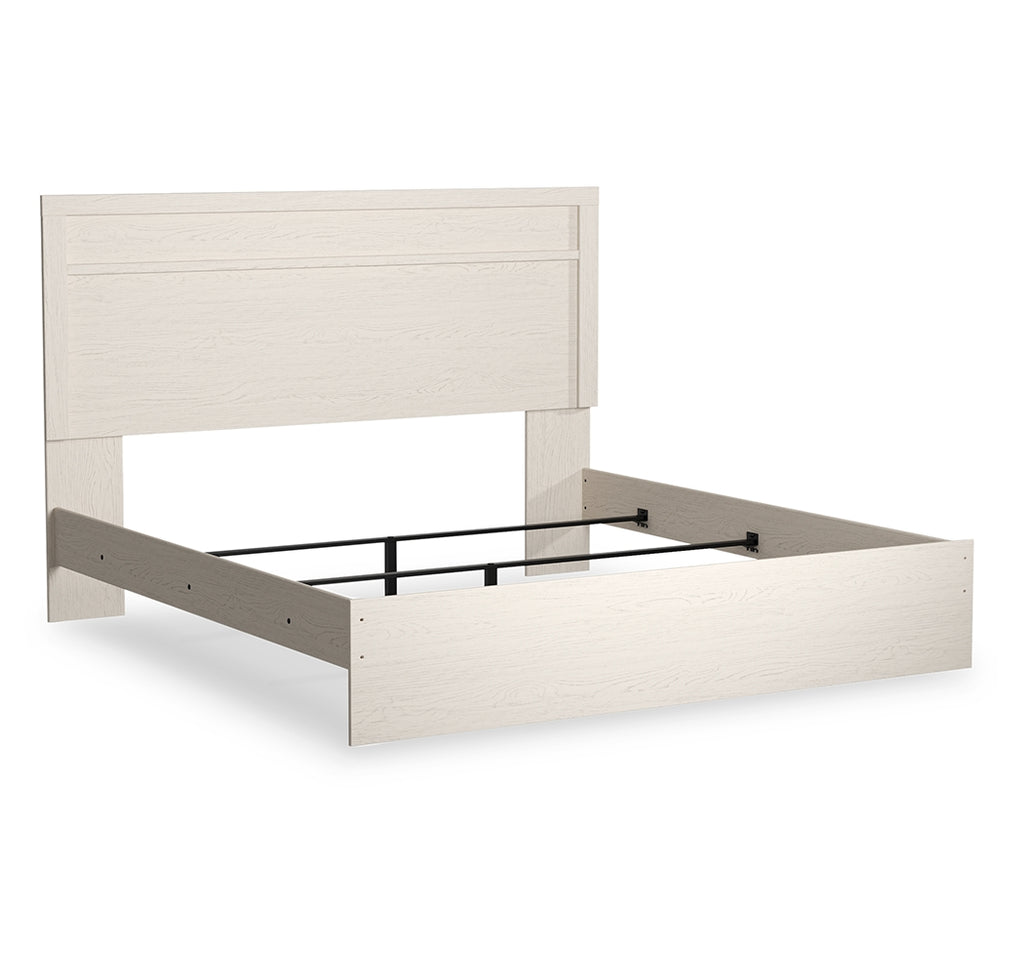 With its clean-lined look and modern attitude, this queen panel bed is a fresh style awakening. A crisp, white hue over subtle replicated wood grain easily complements other furniture finishes. The simple, unadorned profile is given depth and dimension with the addition of plank-style moulding on the headboard—proof that beauty lies in the details.