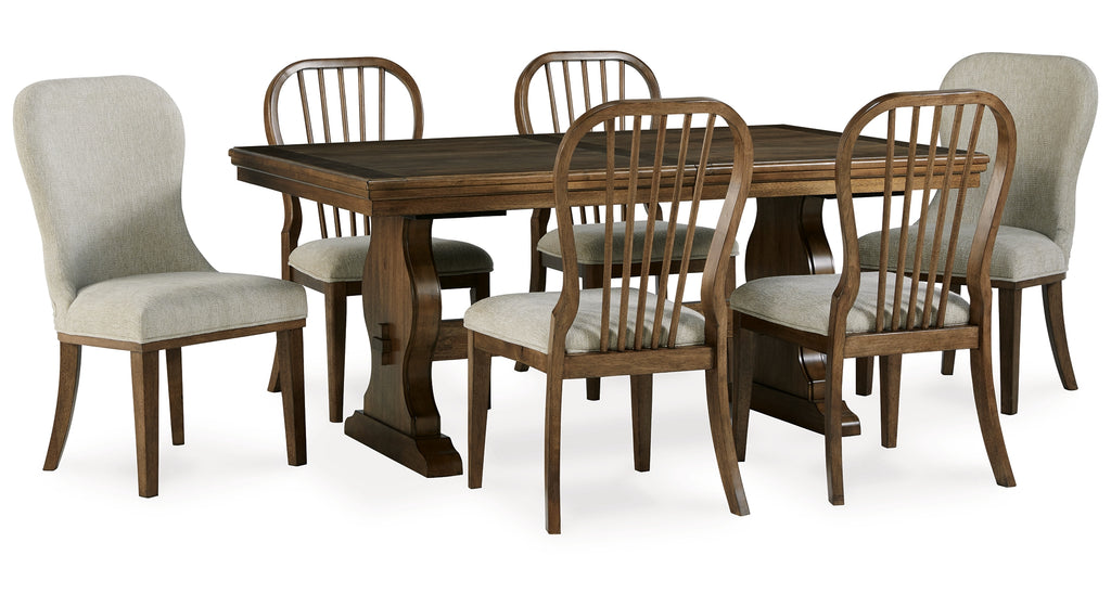 Traditional style doesn’t have to be stuffy. It can feel warm, inviting and beautifully in the moment. Case in point: this dining set. Merging the versatility of an extension table with the comfort of sumptuously upholstered chairs, it has an allure all its own. Equally special is the rich brown finish, which exudes a mood of timeless charm. How's that for relaxed refinement?