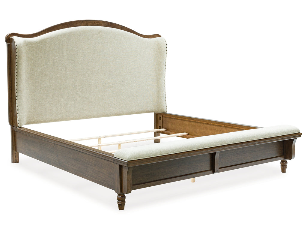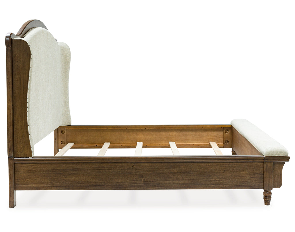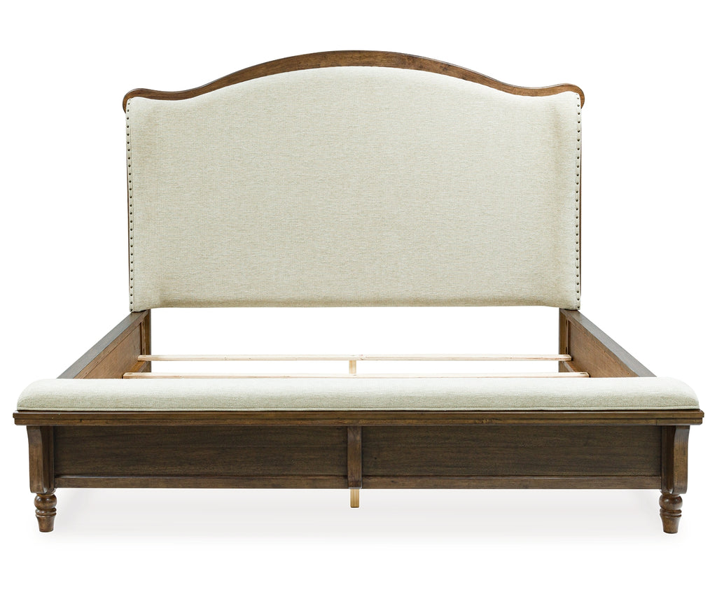 Traditional style doesn’t have to be stuffy. It can feel warm, inviting and beautifully in the moment. Case in point: this queen upholstered panel bed. The alluring piece features a distinctive headboard with a shelter wing design. Its cushioned bench footboard provides the perfect place to sit and slip on your shoes. How's that for relaxed refinement?