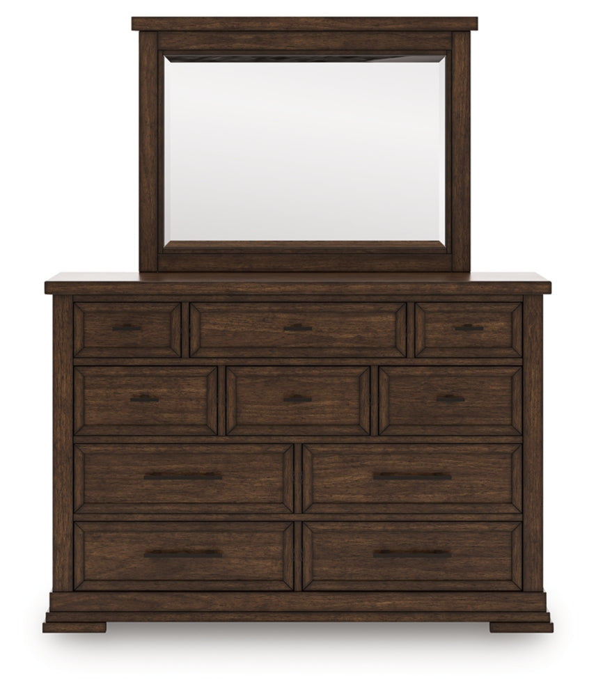Style, simplicity and charm are hallmarks of this dresser with mirror. Created with casual spaces in mind, it has the versatility to suit styles from craftsman to modern farmhouse. The rich brown finish aligns with your refined-meets-relaxed approach to everyday style. And for a timeless touch, ten drawers in various sizes to accommodate your needs are complete with picture frame detailing.