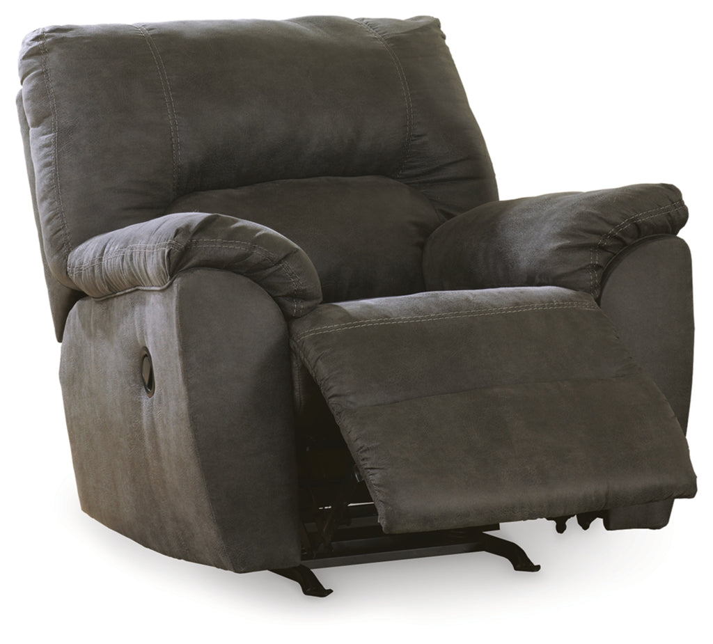 With plush cushions and angled pillow top arms, this rocker recliner takes comfort to a whole new level. Faux vintage leather requires minimal care, making this piece ideal in homes with children and pets. The seat reclines with the pull of a tab, putting total relaxation at your fingertips.