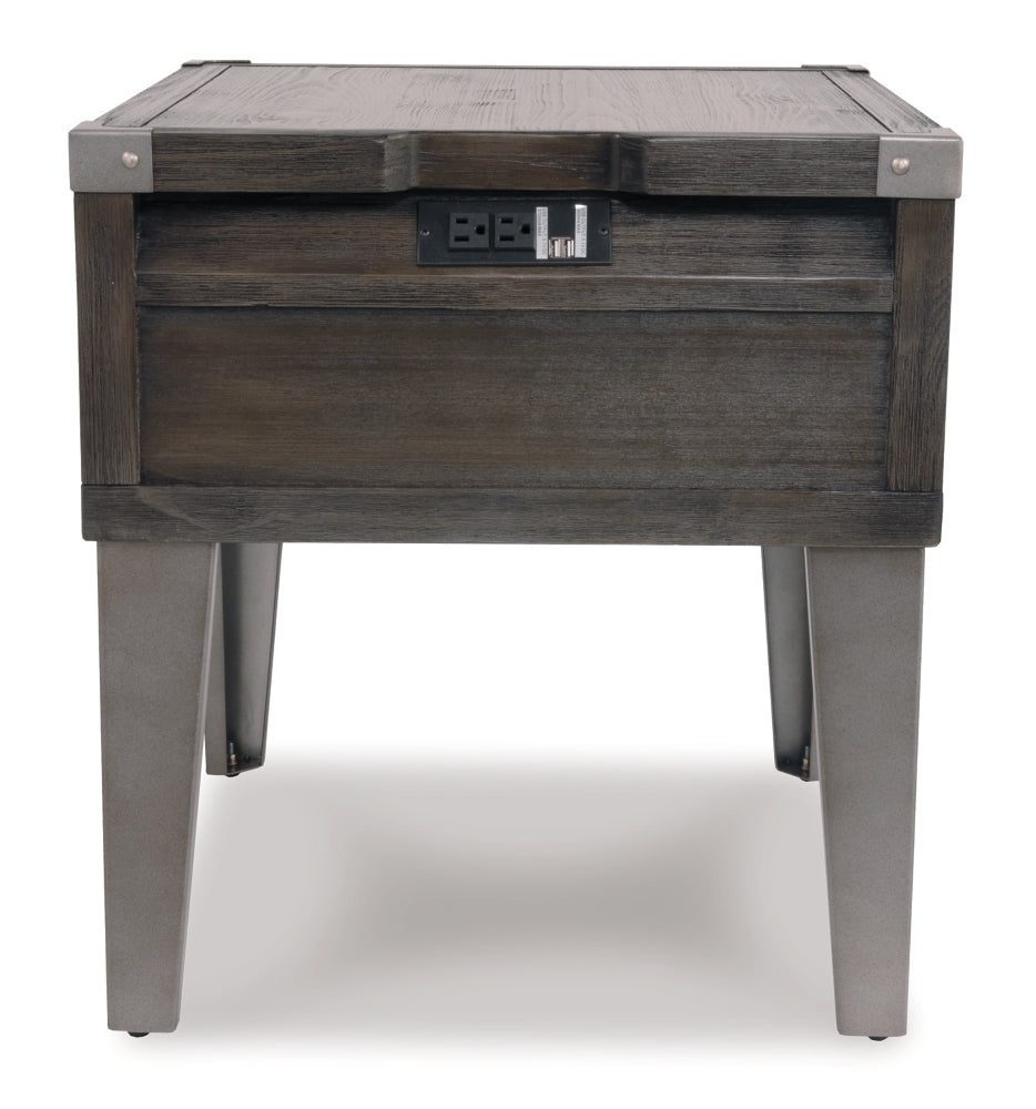 Take a stance for rustic-industrial style with this mixed material end table. Weather-washed pine wood and veneers are contrasted with canted metal legs and corner bracket accents for a uniquely chic merger of earthy beauty and contemporary flair. Power plug-ins and USB charging ports mounted on the back add practical function to great form.