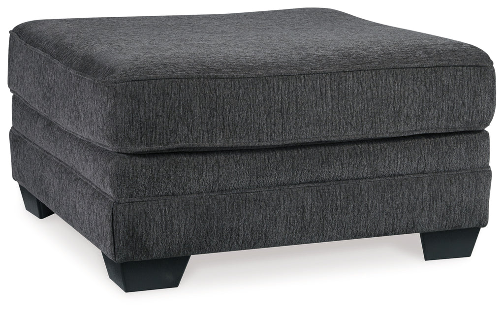 The ultimate sectional centerpiece, this oversized ottoman is big on cool, contemporary style and long on comfort. Plushly upholstered in a slate gray fabric, this ottoman is so generously scaled, you can top it with a serving tray and still have plenty of room to kick up your heels.