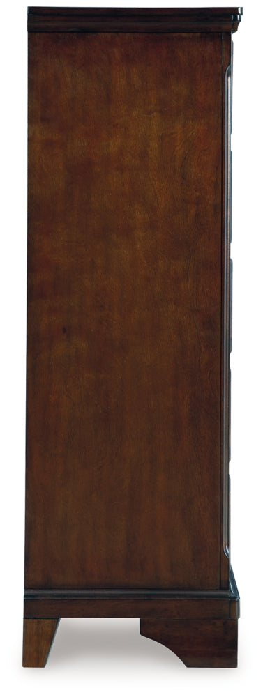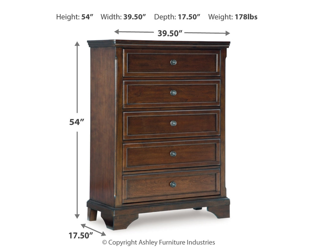 The traditional design of this chest of drawers has a timeless look that adds visual appeal to your bedroom, while its functionalism is equally impressive. There is lots of room for clothes and other essentials in five drawers with a warm brown cherry finish. Creating a beautiful focal point, the drawer fronts are enhanced by round metal knobs in a dark bronze tone for a casual aesthetic.