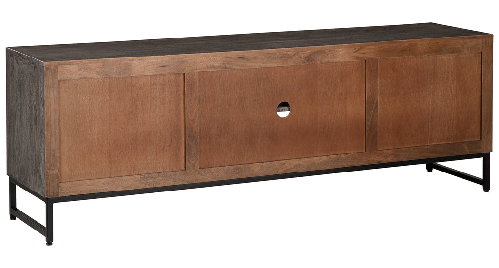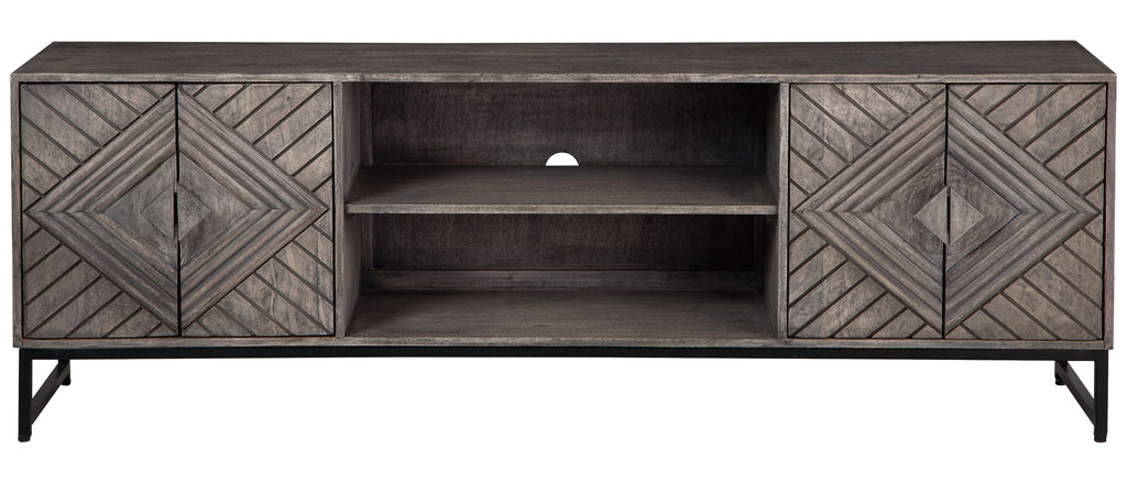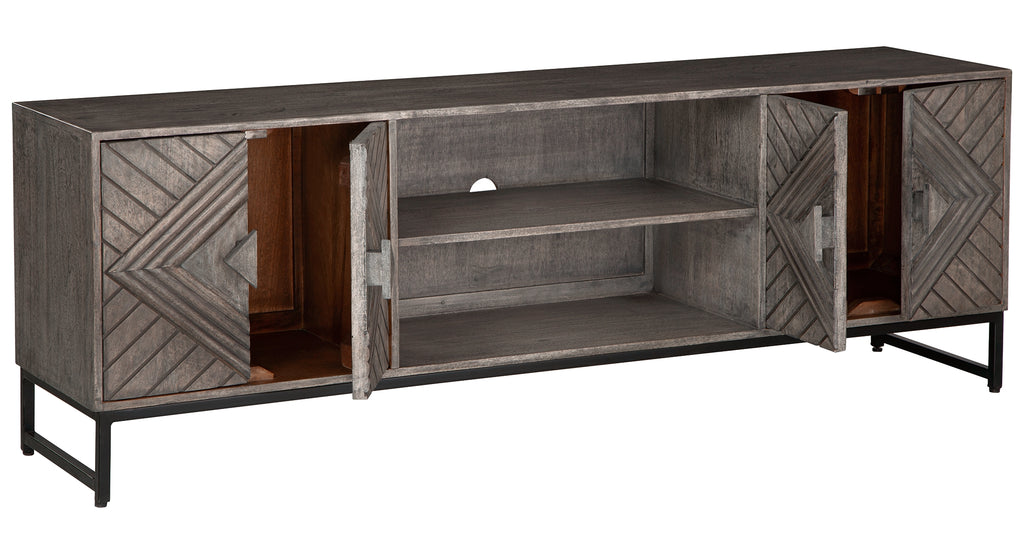 For admirers of understated vintage glamour, this accent cabinet beautifully complements your desired aesthetic. The classic charm of a distressed gray finish meets chic metropolitan styling, with art deco-inspired door fronts and an industrial black metal base. A balanced blend of contemporary and casual design, this piece is the personification of laid-back luxury.