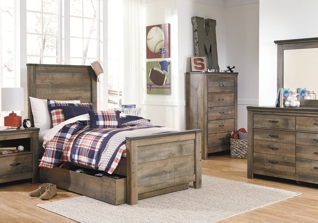 If you love country living, this full panel bed with storage matches your authenticity. Its rustic finish, plank-style details and nailhead trim pay homage to reclaimed barn wood, making for a chic look loaded with charm. The under bed storage unit includes two dividers to accommodate everything from toys and games to books and bedding. Mattress and foundation/box spring available, sold separately.