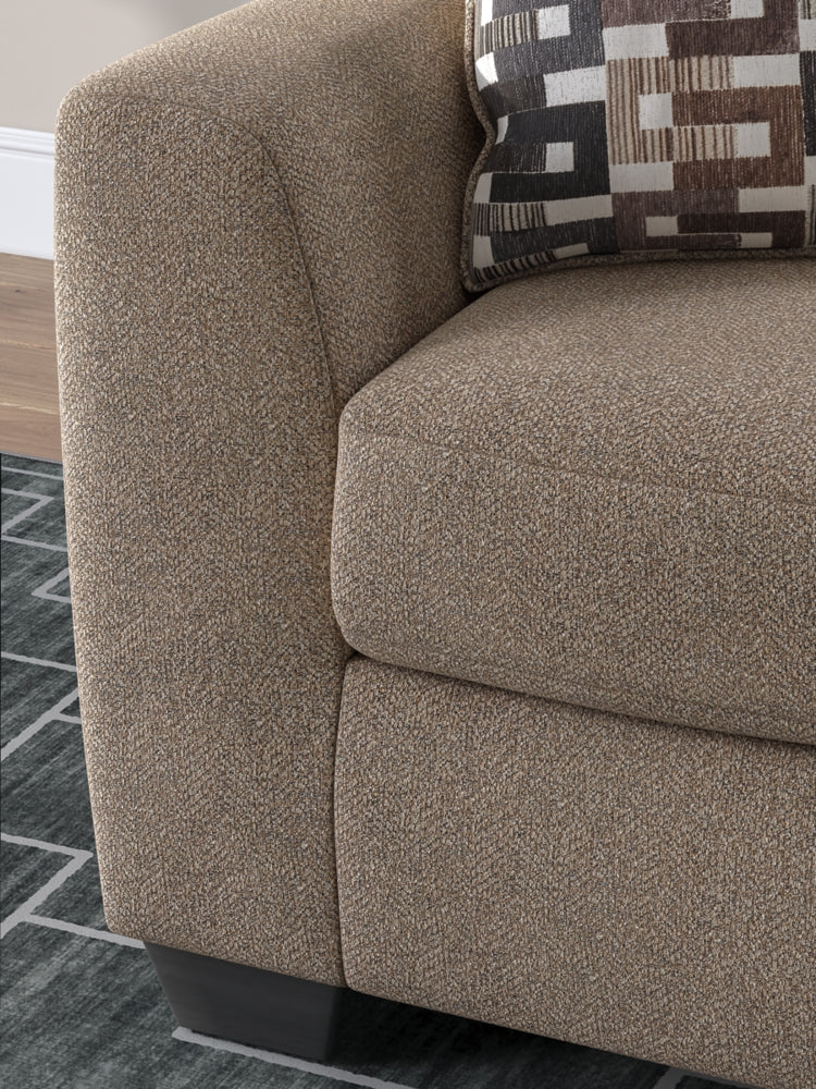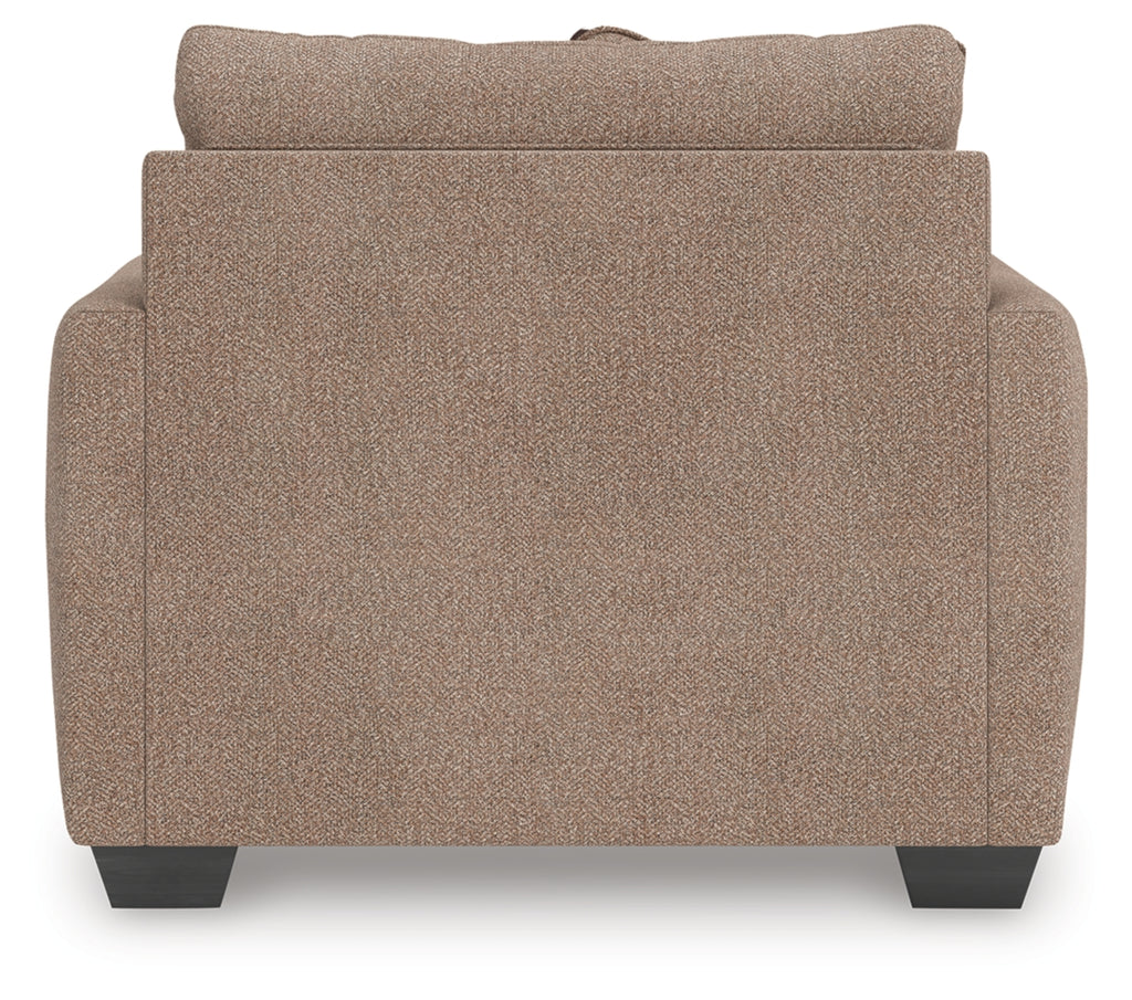 Transitional and right on trend. This oversized chair's upholstery is a delightful change from the ordinary, with hints of soft brown giving the gray hue added depth. It’s punctuated with a chic accent pillow in an eye-catching, stylized stripe design. Whether you're hosting friends and family or relaxing solo, this chair invites homey, comfortable character into your space.