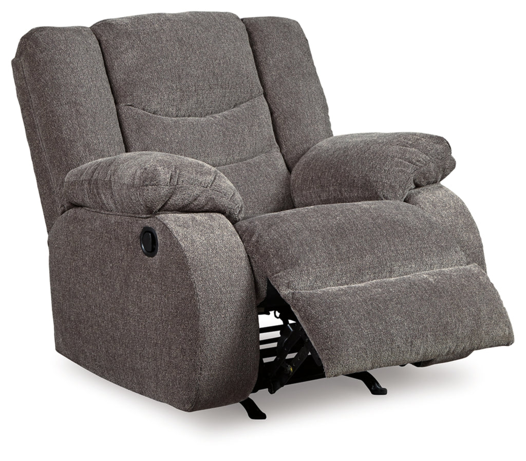 This rocker recliner puts the win in winning. Its waterfall back design and doubly plump pillow top arms team up with soft chenille fabric to go for the goal. Ample seating room makes the comfort possibilities endless. Sit back and relax. You won’t go wrong with this recliner.