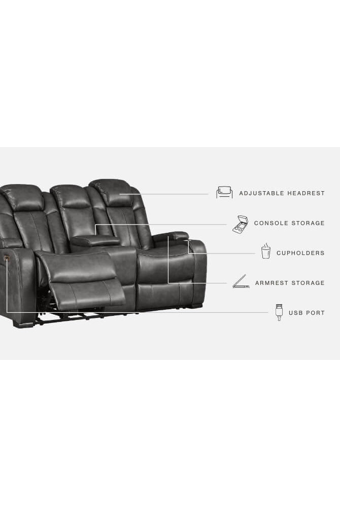 Looking for seating with all the bells and whistles? This power reclining loveseat has you covered. Get double the relaxation as you recline your body and adjust your headrest. Pull up the center console to stash your remotes. With USB charging ports, your devices will enjoy this loveseat, too. Stainless steel cup holders accompany you on either side. It's all wrapped up in quality faux leather with fashion-forward jumbo stitching, for a look and feel you’ll love.