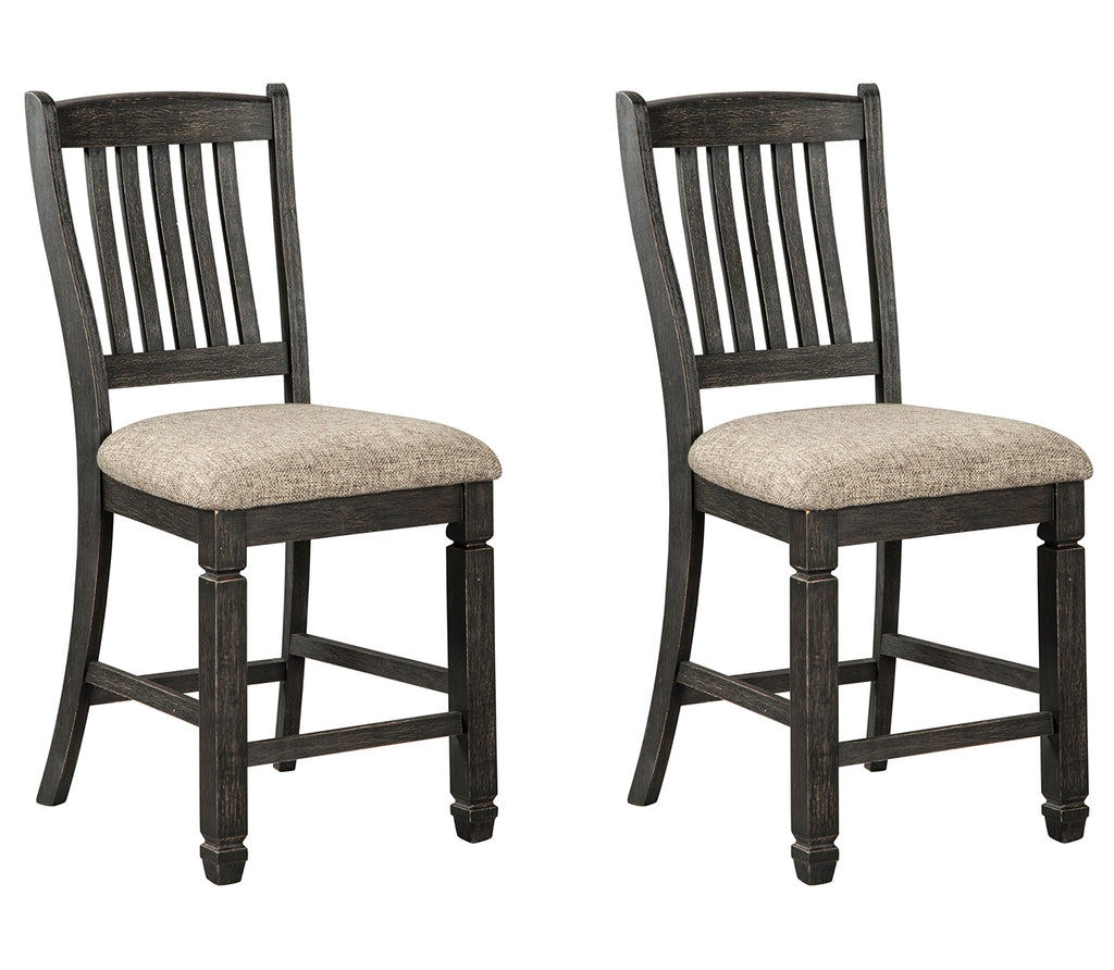 Invite your family into the heart of your home with this upholstered bar stool. Framed back and tapered legs are a sturdy foundation. Black finish is beautifully textured. Heavily woven fabric has a quality feel-good touch. Silvertone nailhead trim is decorative without all the fuss. This is trend-right urban farmhouse style.