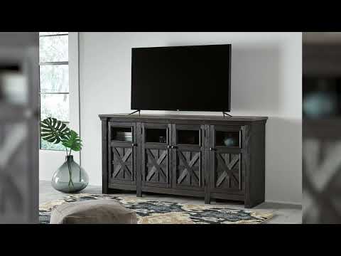 Shabby chic with a hint of down-home country, this TV stand appeals to today’s more relaxed sensibilities. Its richly rustic two-tone effect blends a textured black finish with a weathered gray-brown top for an easy-elegant aesthetic. Framed doors with crossbuck detailing and clear glass insets bring a touch of modern farmhouse to the scene.