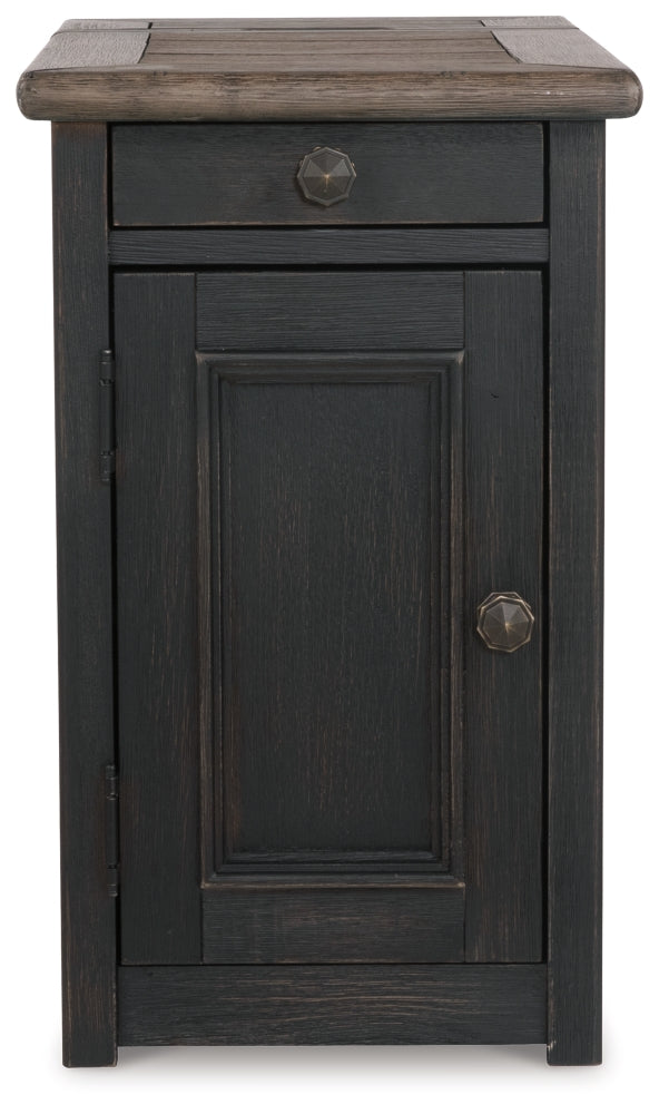 Shabby chic with a hint of down-home country, this chairside end table is all the talk of today’s design world. Wood grain shows through the weathered gray-brown top in all of its earthy pleasure. A pull-out tray with lovely traditional hardware has two cup holders. Fuel up your devices with the convenient charging station.