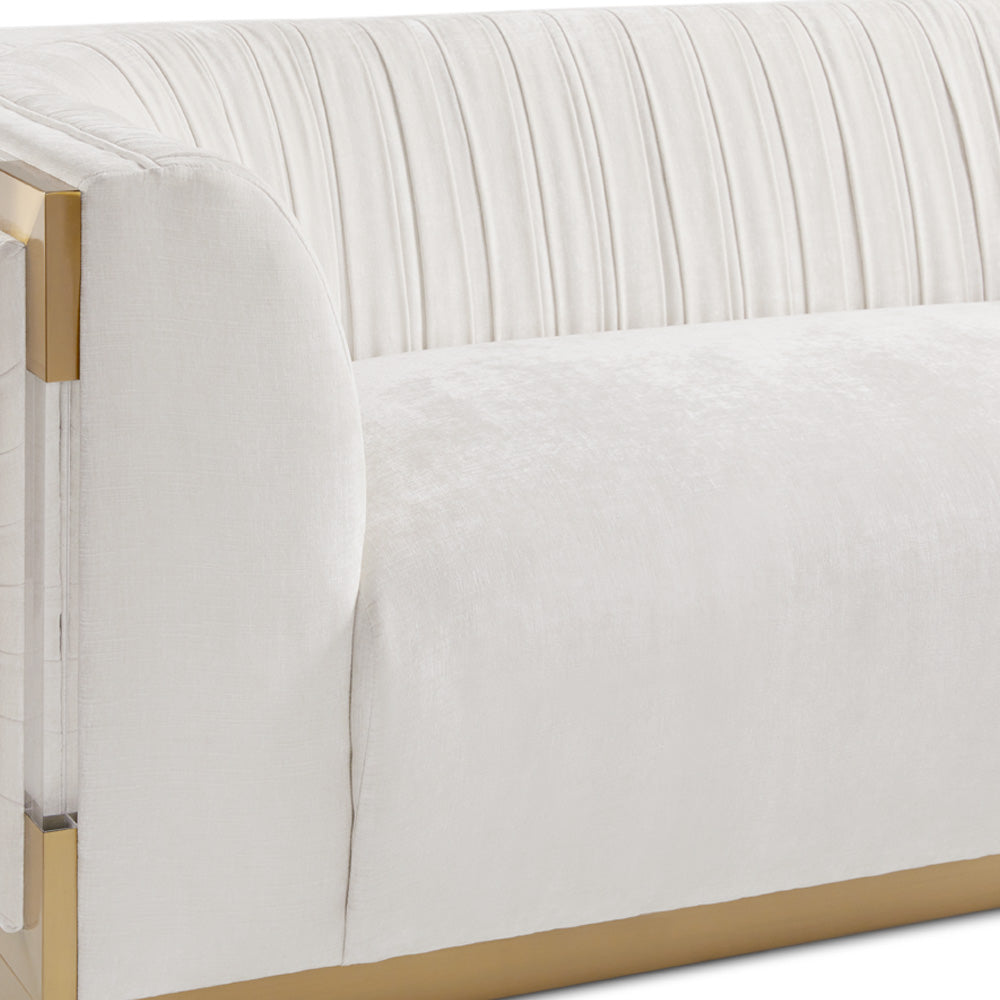 Unwind in the lap of luxury with the Vanilla Bliss Gold-Framed Loveseat. Adorned with the plush, creamy textures of Contessa Vanilla fabric and supported by a matte gold steel frame, this loveseat offers an intimate seating solution with an opulent twist. Designed and made in Canada, it spans 187.5 cm in width, providing the perfect space for cozying up in style. Whether it's the centerpiece of your living room or a luxurious addition to your bedroom, this loveseat promises comfort and elegance.