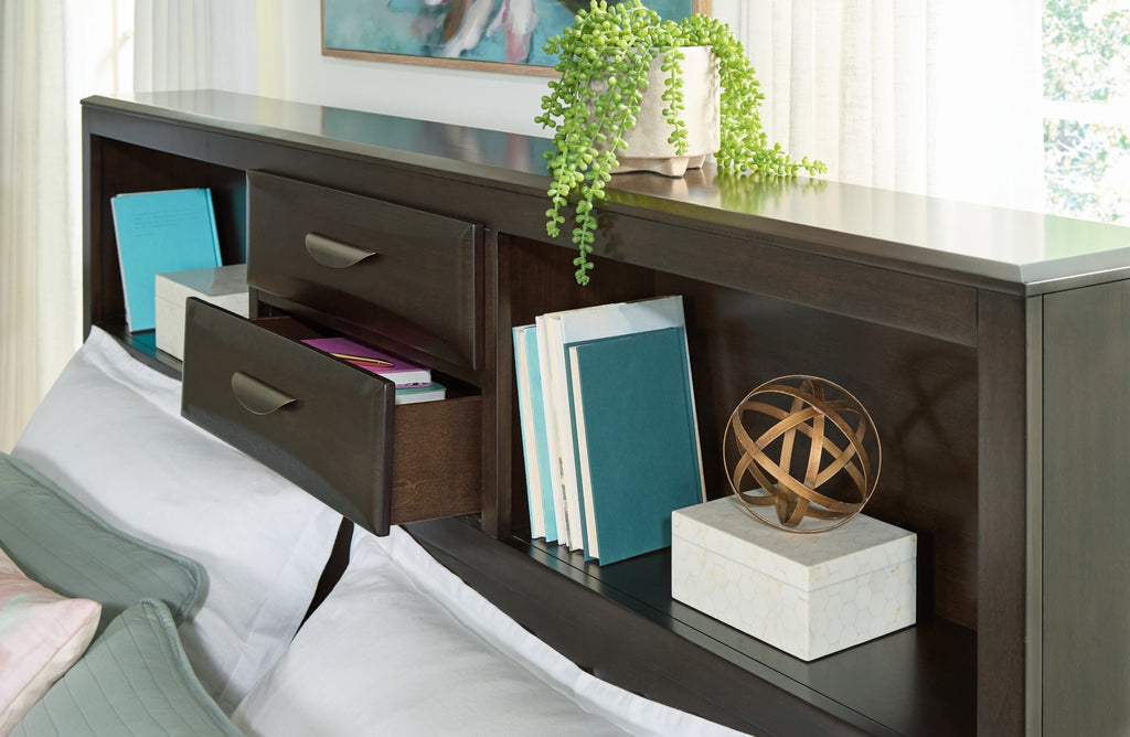 A rich, metropolitan finish. Unbeatable function. With this king storage bed, it’s a breeze to create a casual contemporary hideaway full of style and convenience. It combines thoughtful craftsmanship and handy storage, with assorted drawers to help you maintain an organized and clutter-free space. Cubbies in the headboard keep bedtime reads close while also acting as the perfect perch for bedroom decor.