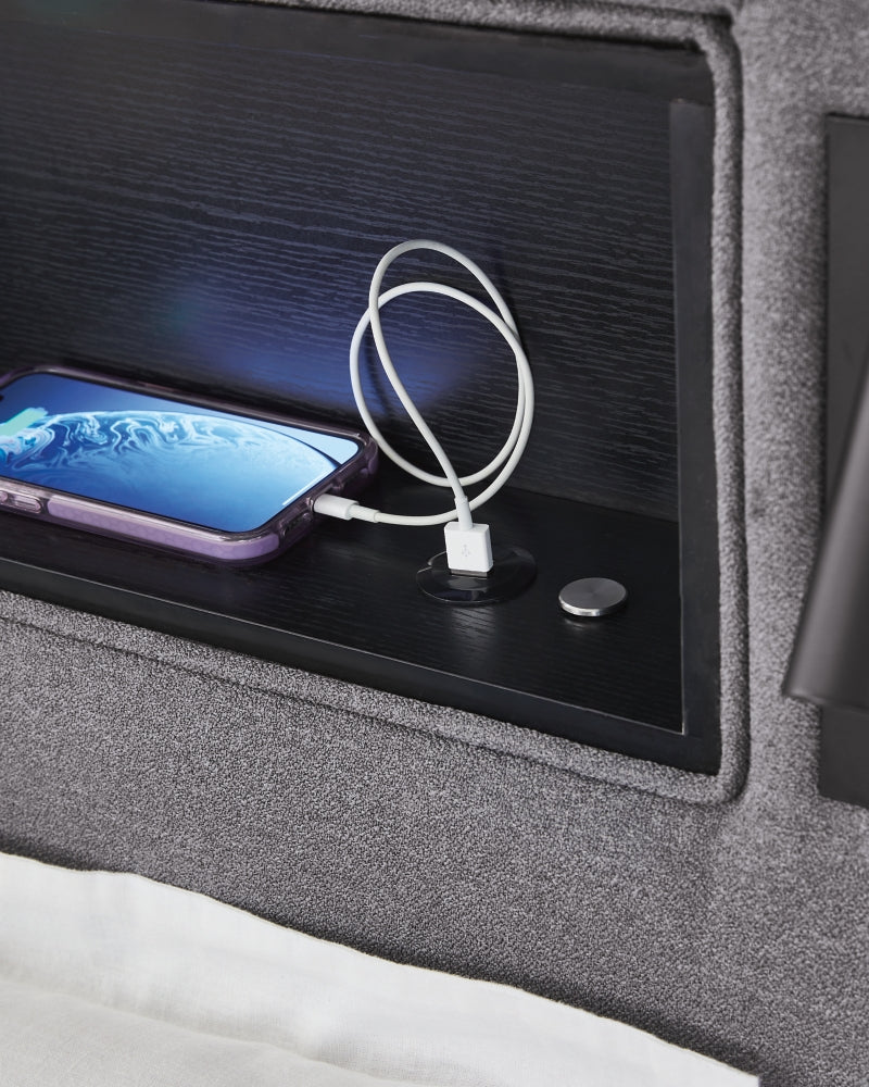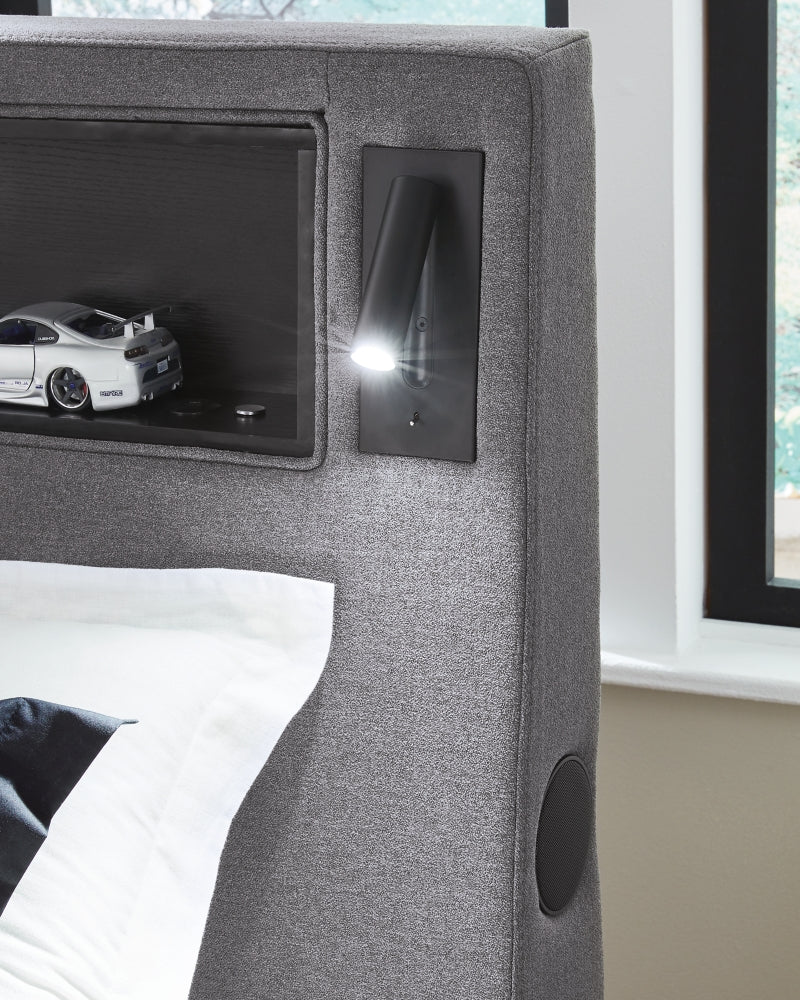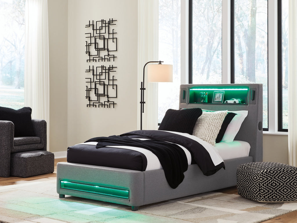 Snooze in style with this twin upholstered bed. It brings delightful function to winding down before bedtime, with an adjustable LED reading light on each side. And for added flair, multicolored ambient lighting brings an ultra-cool vibe to the overall look. Combining modern convenience with captivating design, this bed revamps your restful retreat like never before.