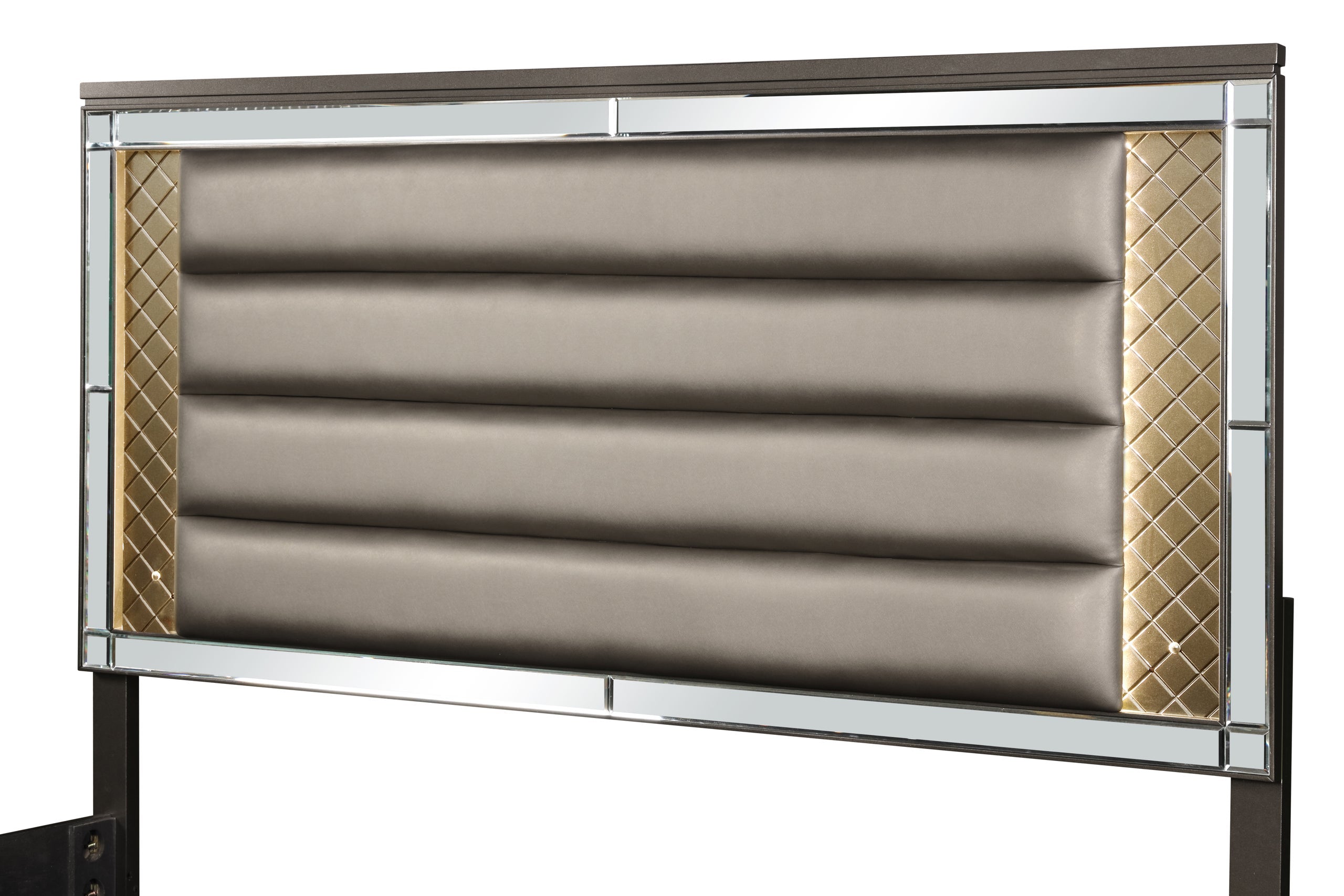 Enhance the elegance of your bedroom with this stunning Bedroom Set. Combining contemporary style with luxurious features, this set is available in both king and queen sizes. The set includes LED backlit mirrors and headboards, adding a modern touch to your room. The plush faux leather, channel-tufted upholstered headboard offers comfort and sophistication, while the low footboard and turned feet add a classic touch. The mirror trim and diamond print texturing accents complete the look with a touch of glamour.