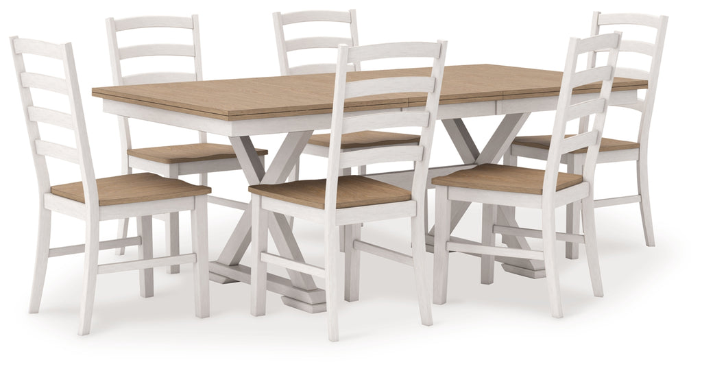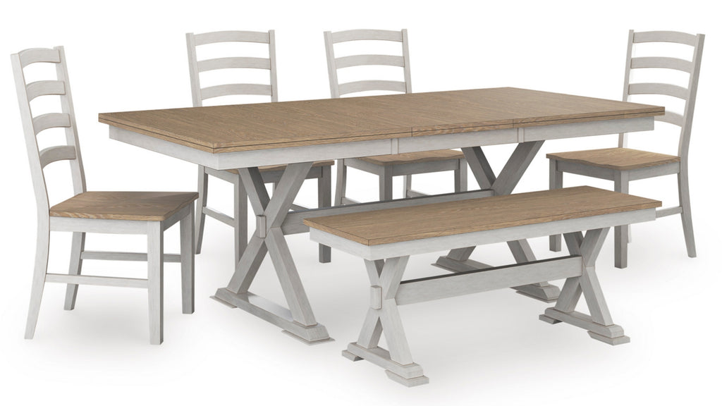 Busy breakfasts and family dinners get a dose of modern farmhouse flair with this dining package. Its two-tone finish contrasts a light butcher block hue with antiqued white for an utterly charming effect. An effortless dining solution, this set adds a touch of chic character to your space.