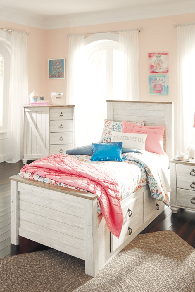 This full panel bed with storage is the ultimate statement piece for a coastal cottage or shabby chic inspired retreat. Its whitewash finish is wonderfully easy on the eyes. Faux plank tops on the headboard and footboard infuse a driftwoody look that has our minds drifting away to beachy-keen escapes. Two smooth-gliding drawers keep linens, blankets and jammies close at hand. Mattress sold separately.