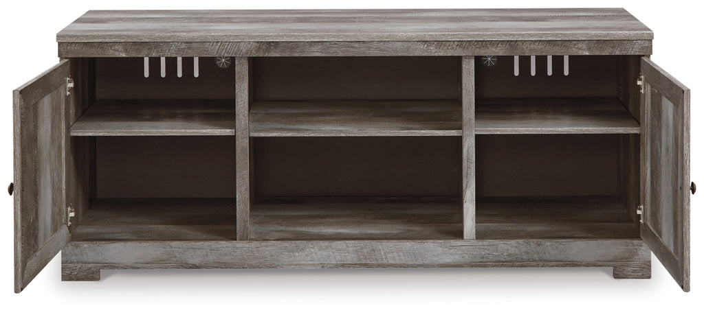 This TV stand with fireplace option is sure to win your heart with its daring designer take on modern rustic. The stand’s crisp, clean and minimalist-chic profile is enriched with a striking replicated oak grain with thick plank styling and a weathered gray finish for that much more authentic character. Crossbuck detailing adds a brilliant barn door inspired touch. Compatible with W100-101 and W100-02 electric fireplace inserts, sold separately.