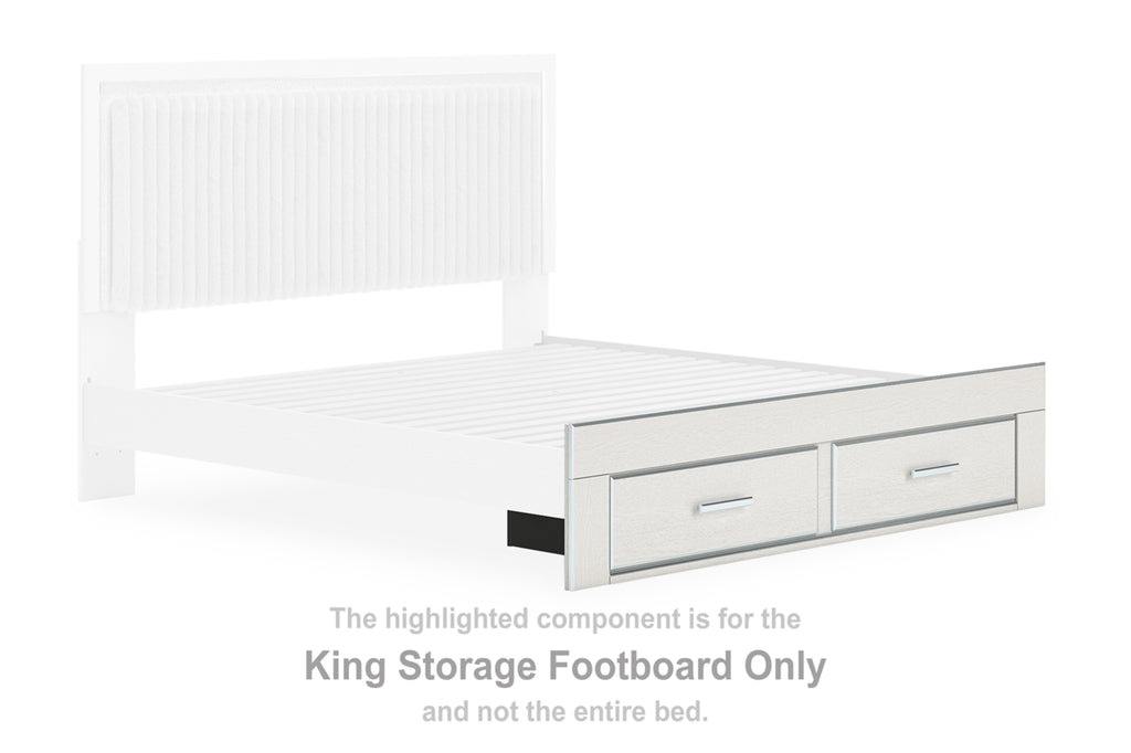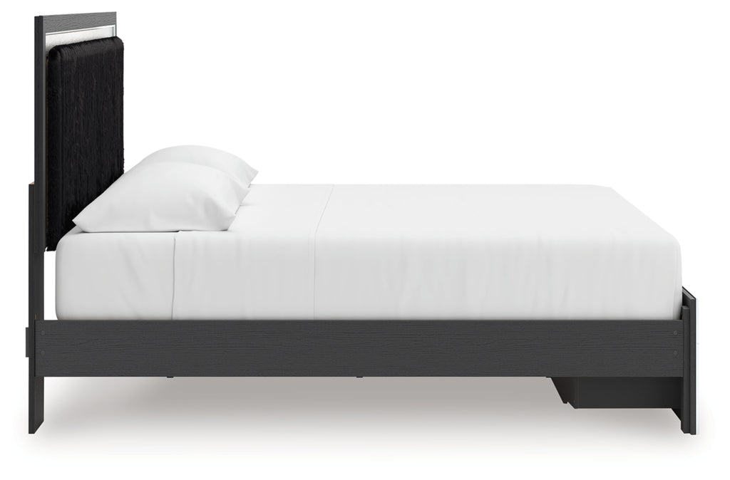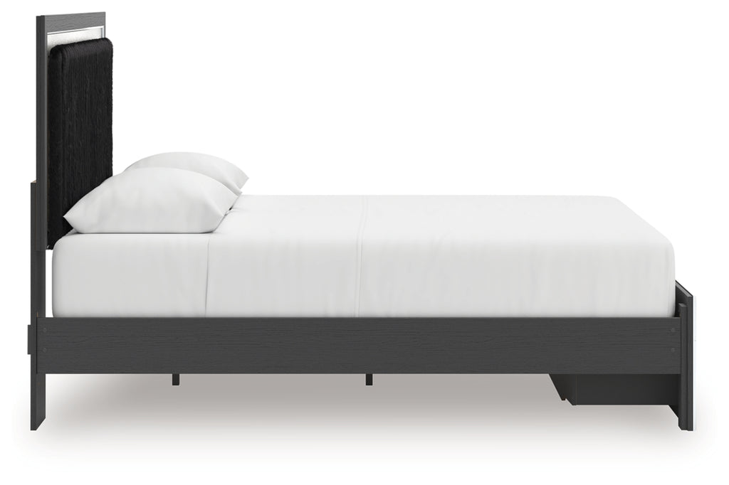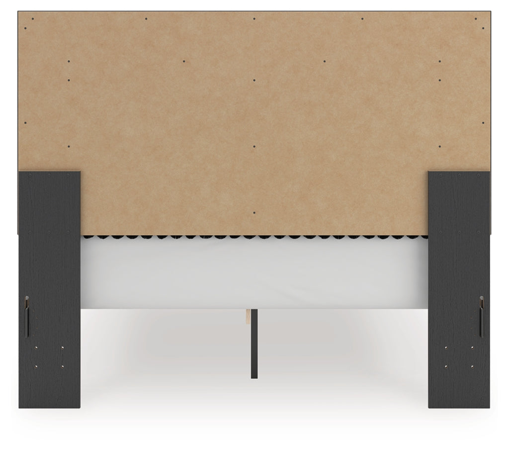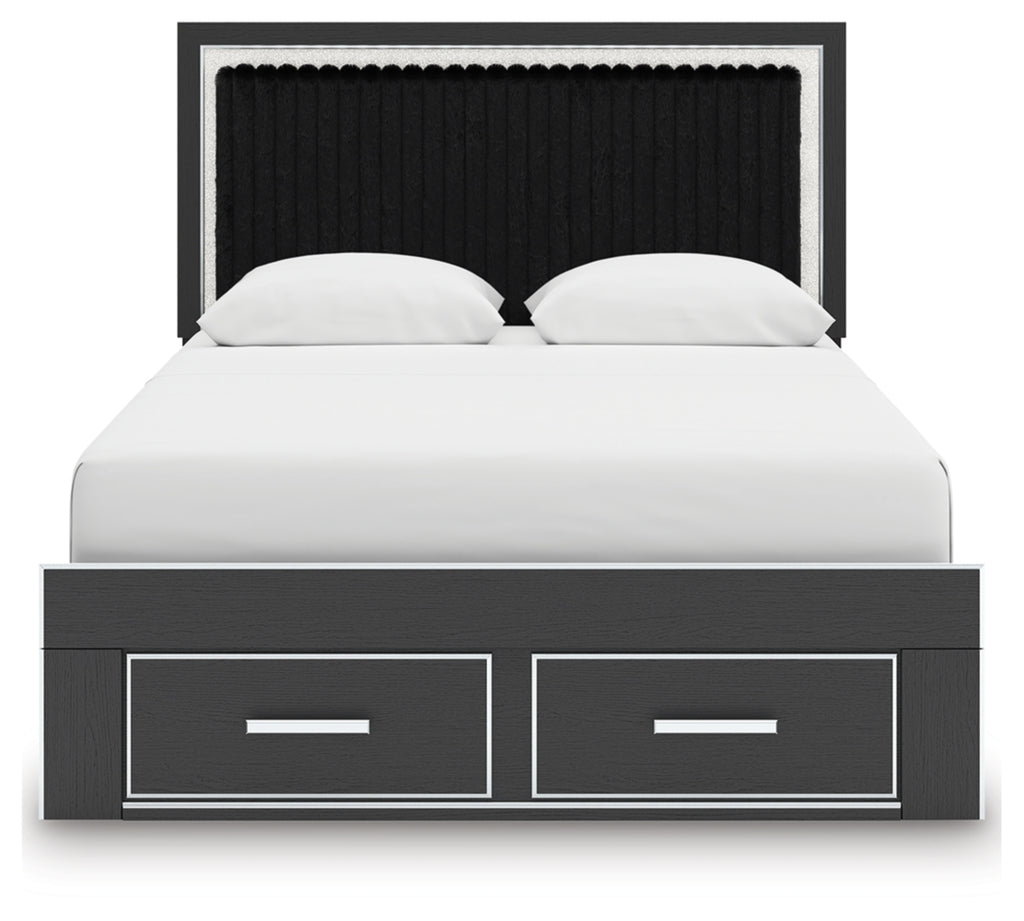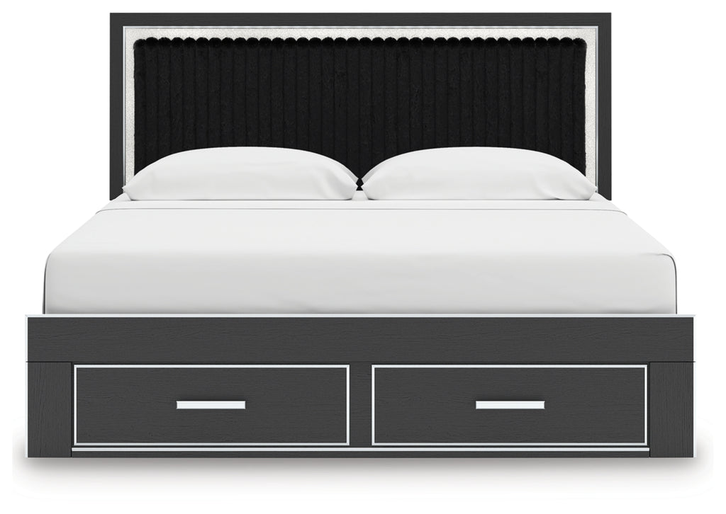 Features- Includes upholstered panel headboard, storage footboard, platform rails and roll slats