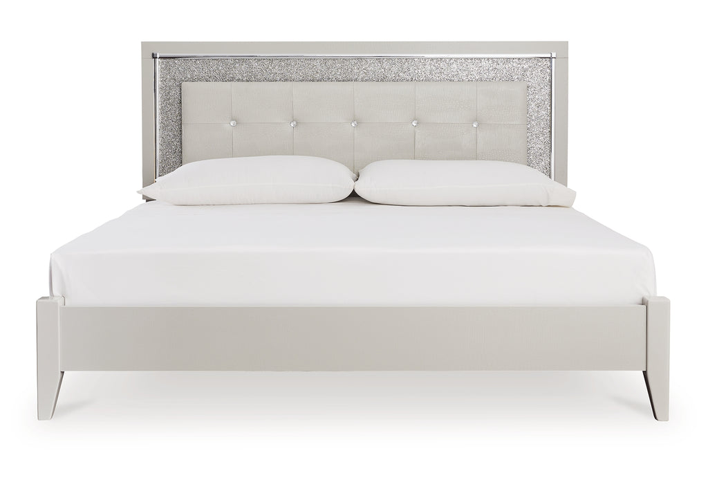 Zyniden King Upholstered Panel Bed with Mirrored Dresser