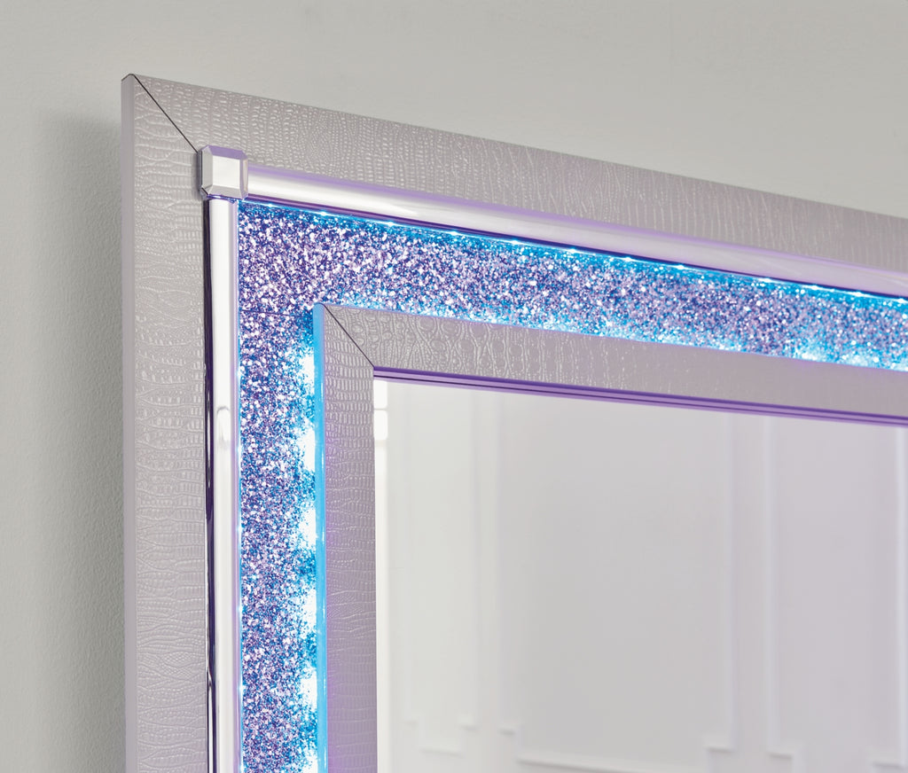 Zyniden King Upholstered Panel Bed with Mirrored Dresser and 2 Nightstands